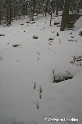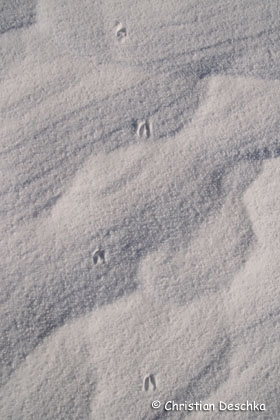 Laufende Rehe hingegen hinterlassen unterschiedlich aussehende "Vierer-Abdrücke" mit größeren Abständen dazwischen.