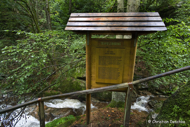 Nebenan gibt eine Tafel Auskunft darüber, dass diese im Volksmund als "Teufelsboding" (Teufelsbottich) bezeichnete Stelle als des Teufels liebster Badeplatz gilt ...