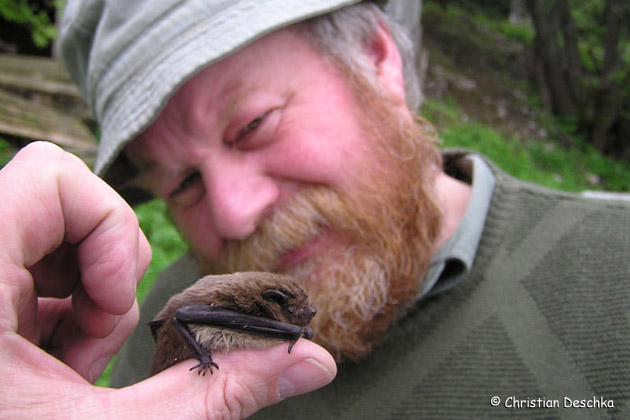 Stark behaart ist die Schwanzflughaut dieser Rauhautfledermaus. Dieses Männchen ist fast jedes Mal an ein und demselben Standort anzutreffen. Im Spätsommer tauchen allährlich mehrere Rauhäute auf und nutzen unsere Kästen als Balzquartiere.