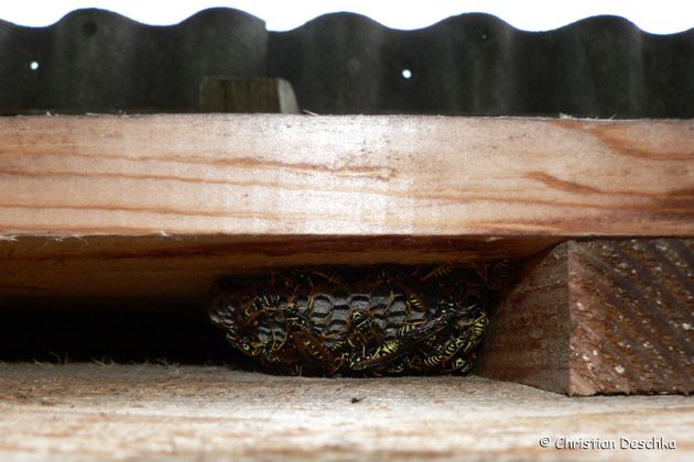Feldwespen bauern ihr Nest nur ausgesprochen selten in die spaltenförmigen Hohlräume. Diese werden aber regelmäßig von Stubenfliegen zum Überwintern genutzt. Seit Herbst 2009 finden wir auch Asiatische Marienkäfer.