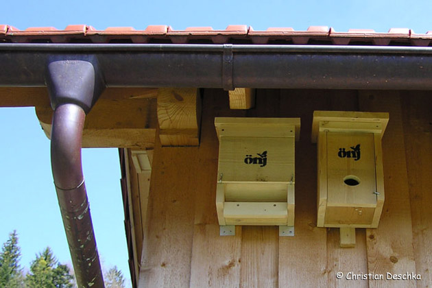 Hier zwei Modelle im Vergleich: Links das "Modell nach Issel", das eine Schleuse eingebaut hat, die Vögel abhält. Rechts ein Fledermauskasten ähnlich einem Meisenkasten, allerdings mit querovalem Einflugloch im unteren Drittel.