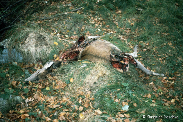 | Fällt es dem Luchs leicht Beute zu machen, wird diese mitunter nur unvollständig genutzt. Man sollte solche Kadaver - hier eine Hirschkuh - aber unbedingt liegen lassen, da der Luchs in Hungerperioden mitunter Wochen später wieder zurückkehrt. |