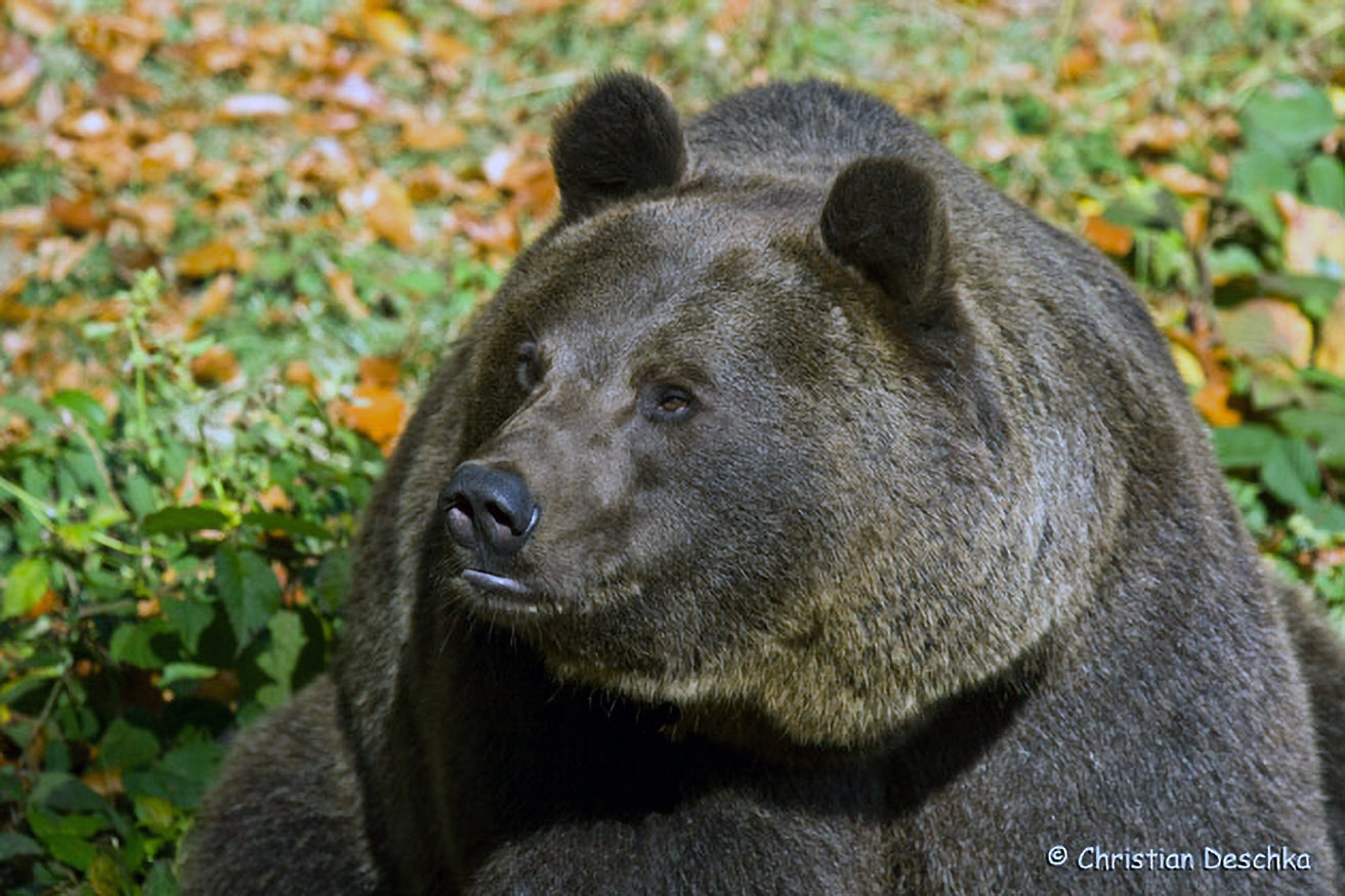 Der massige Körper und der dicke Kopf mit den rundlichen Ohren geben dem Braunbären sein charakteristisches Aussehen. Braunbären sind Raubtiere, deren Nahrung einen hohen pflanzlichen Anteil hat (Allesfresser!).
