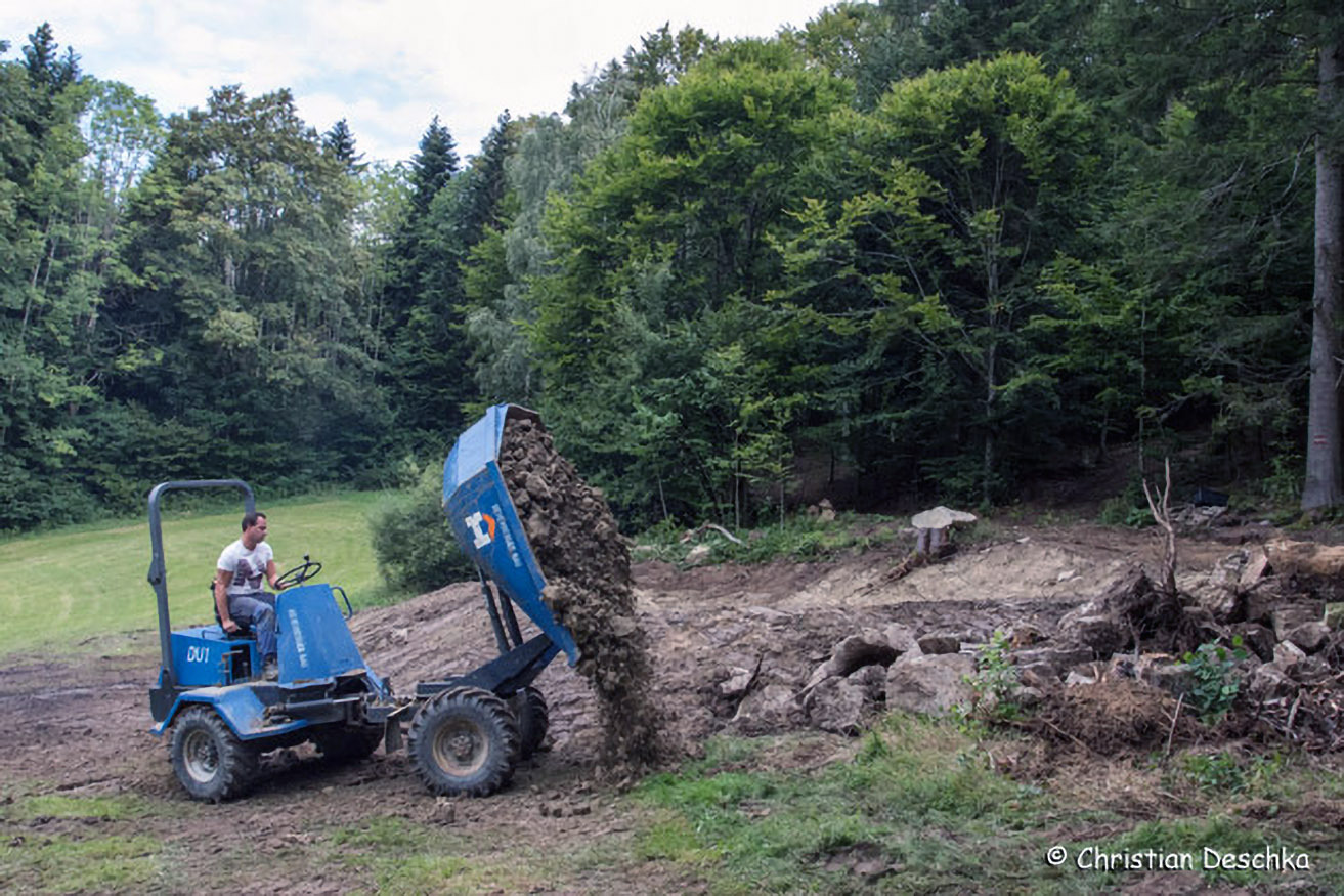 Die dabei aufgelesenen Lehmreste verwendeten wir beim zuletzt angelegten Teich für eine weitere Erhöhung der Dammkrone.