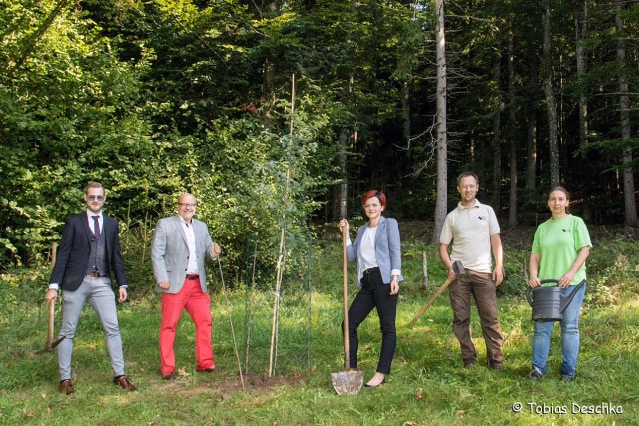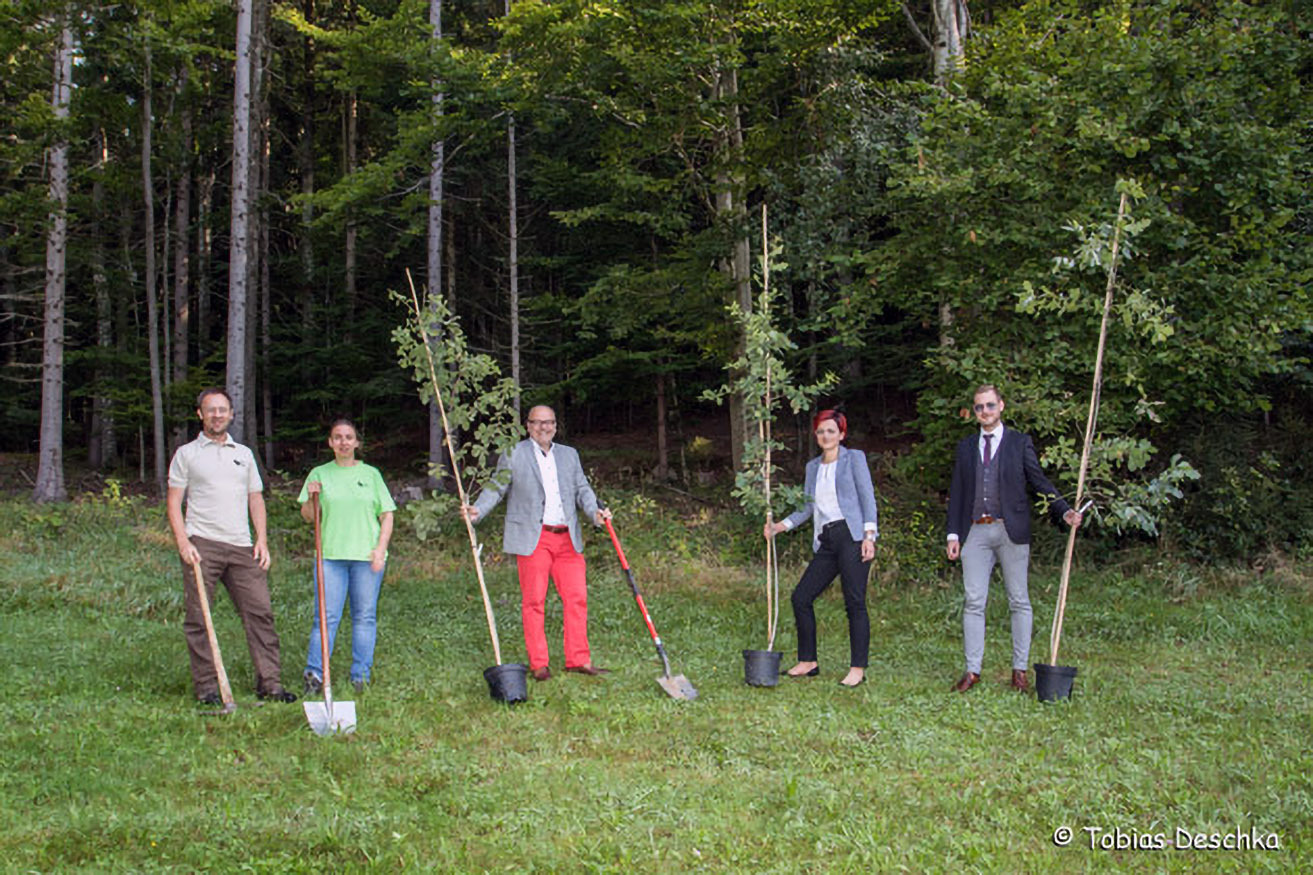 Der Augenoptiker Fielmann sponsert uns heuer 300 Bäume samt Baumschutz (Eisenstäbe + Zaun gegen Wildschäden). Anfang September übergaben uns drei Linzer Fielmann-Niederlassungsleiter die ersten drei Bäume auf der Feldwiese.