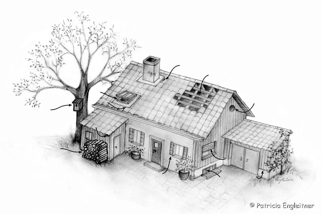 Auch an Privatgebäuden versuchten wir möglichst viele Fledermausquartiere ausfindig zu machen. Die Pfeile zeigen bevorzugte Verstecke.