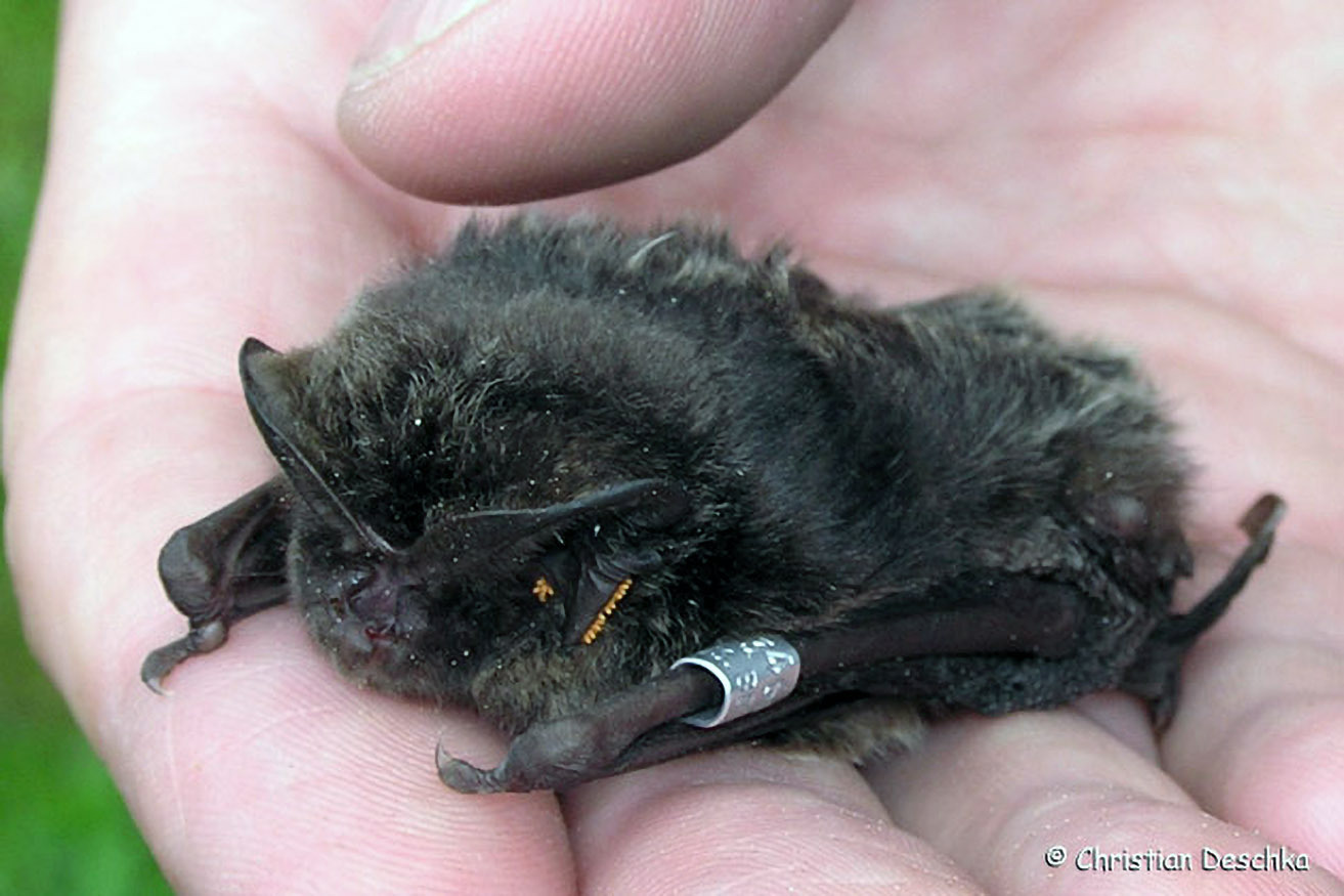 Mopsfledermäuse sind an der dunklen Färbung, der Stupsnase und den breiten Ohren mit vielen orangen Milben erkennbar. Am linken Unterarm trägt diese Fledermaus einen "Ring" (Flügelklammer mit Nummer), der uns ein Wiedererkennen ermöglicht.