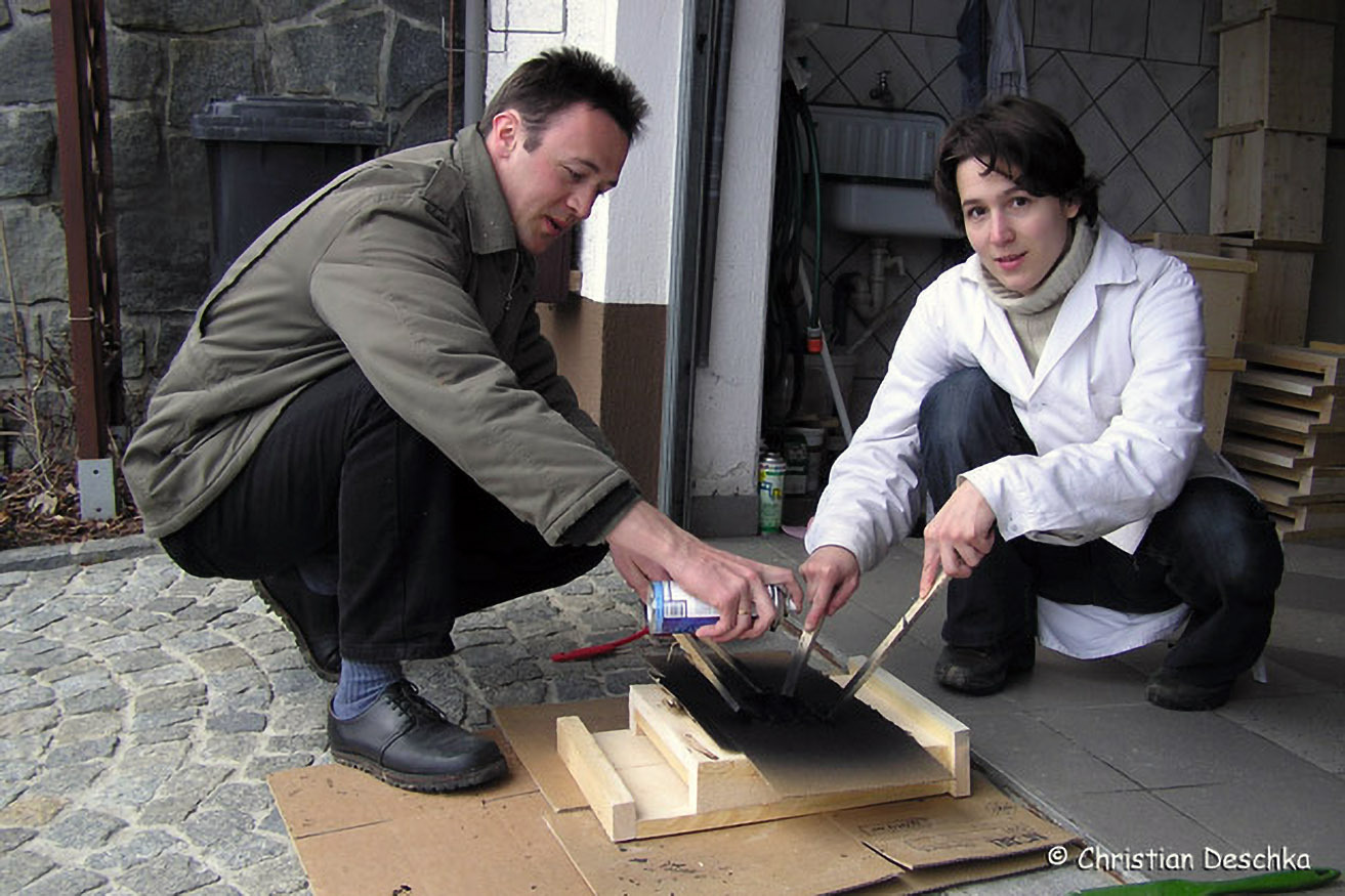 Spalten hinter dem Kasten werden ebenfalls gerne angenommen, insbesondere von Einzeltieren. In diesem Fall wurde der Kasten auf einen Keil geschraubt, um ihn vom Boden aus besser einsehbar zu machen.