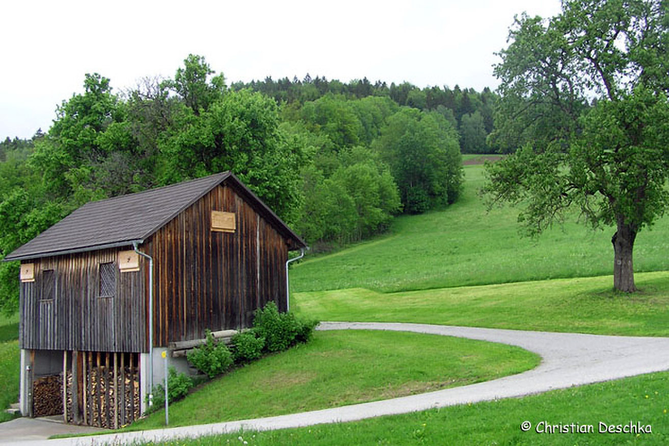Die Montage ist auf Holzwänden am einfachsten. Idealerweise werden die Kästen in 3-4 m Höhe unter dem Dachvorsprung (Witterungsschutz) oben auf die Leiter gestellt und angeschraubt. Ein Zimmermannsgurt erleichtert die Arbeit.