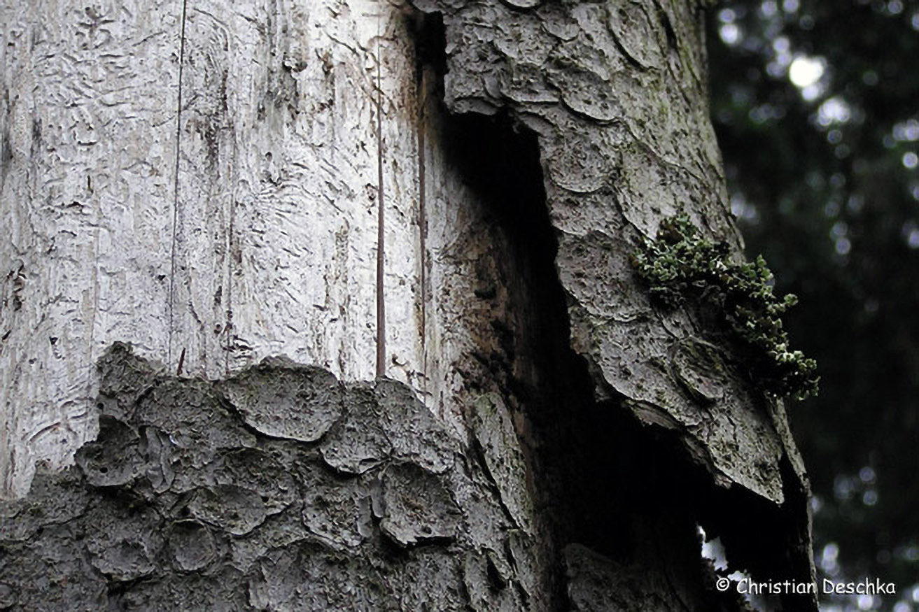 Durch Blitzschlag sowie Ablösen der Rinde entstehende Spaltenquartiere sind ebenfalls höchst wertvoll.