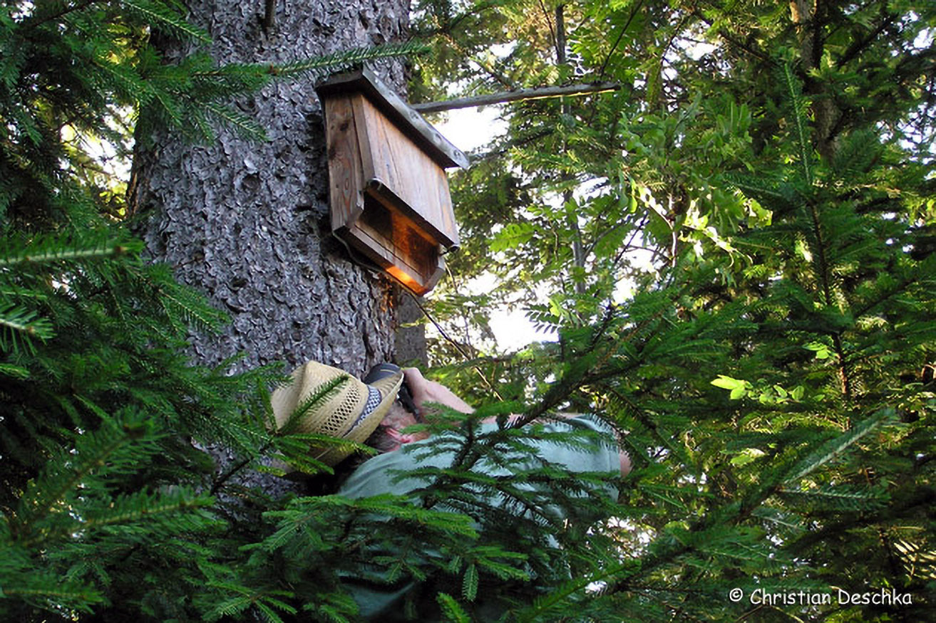 Um Spaltenbewohner im Wald sichtbar zu machen, hängte Hubert Katzlinger kleine "Flachkästen" auf. Diese können durch Reinleuchten sowie durch Abnahme der Front kontrolliert werden.