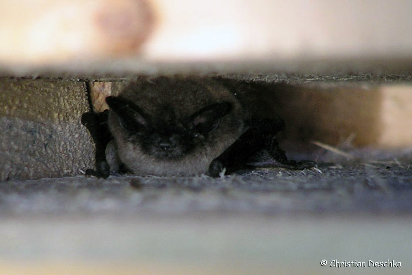 Die Mopsfledermaus hat aber auch gelernt, Verstecke an menschlichen Gebäuden zu nutzen. Wo sie dies regelmäßig tut, sind manchmal weißliche Spuren zu finden.