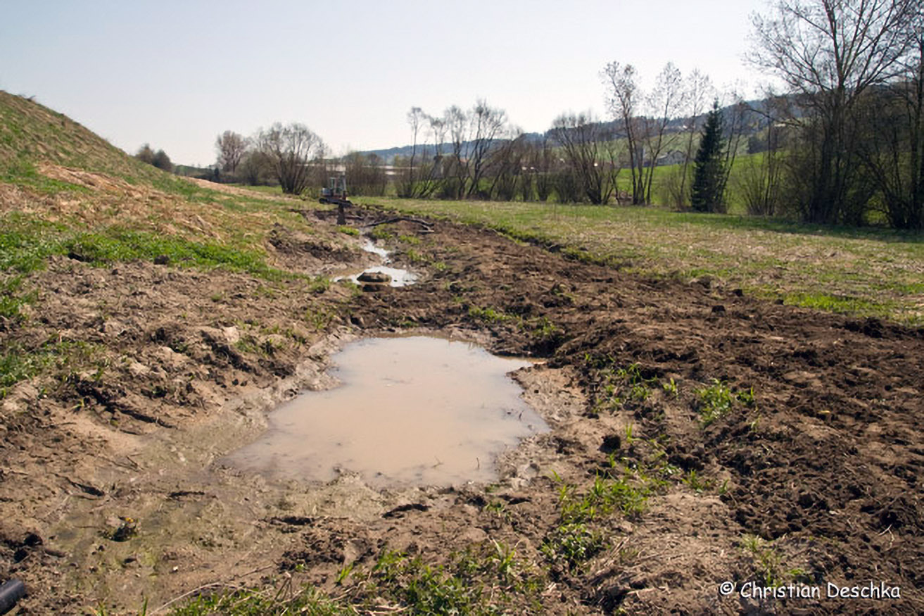 Auch auf größeren Baustellen mit Wasserpfützen können Unken (vorübergehend!) einen Gewässer-Lebensraum finden. Ein Beispiel dafür ist dieser in Bau befindliche Fischteich.
