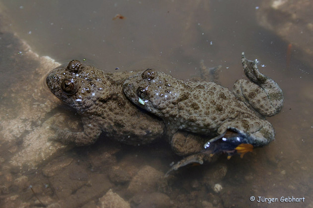 Bei genauem Hinsehen sieht man die Rufer. Es handelt sich um Gelbbauchunken, die man an der lehmbraunen, warzigen Oberfläche, den kugelförmig hervortretenden Augen und den herzförmigen Pupillen erkennen kann.