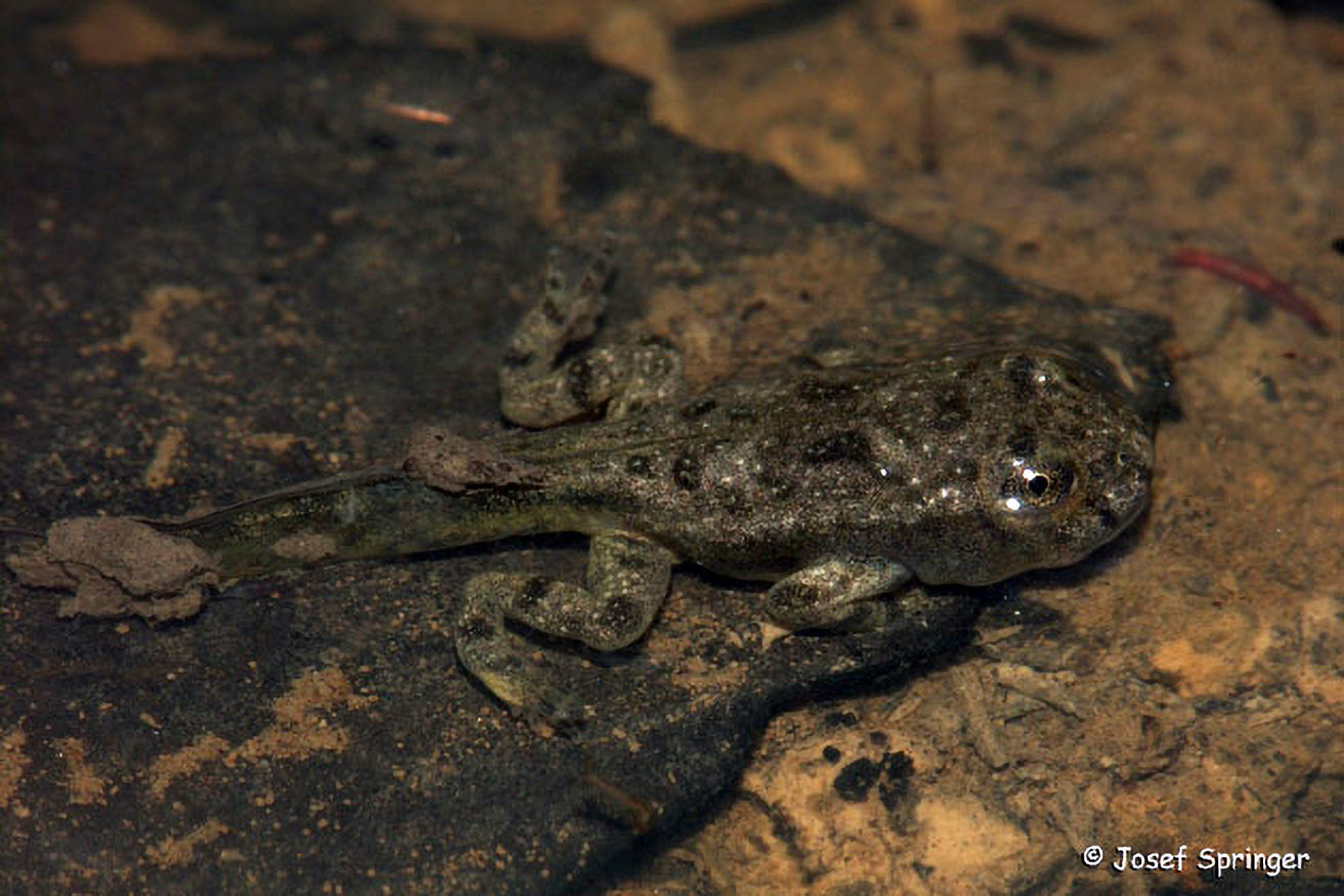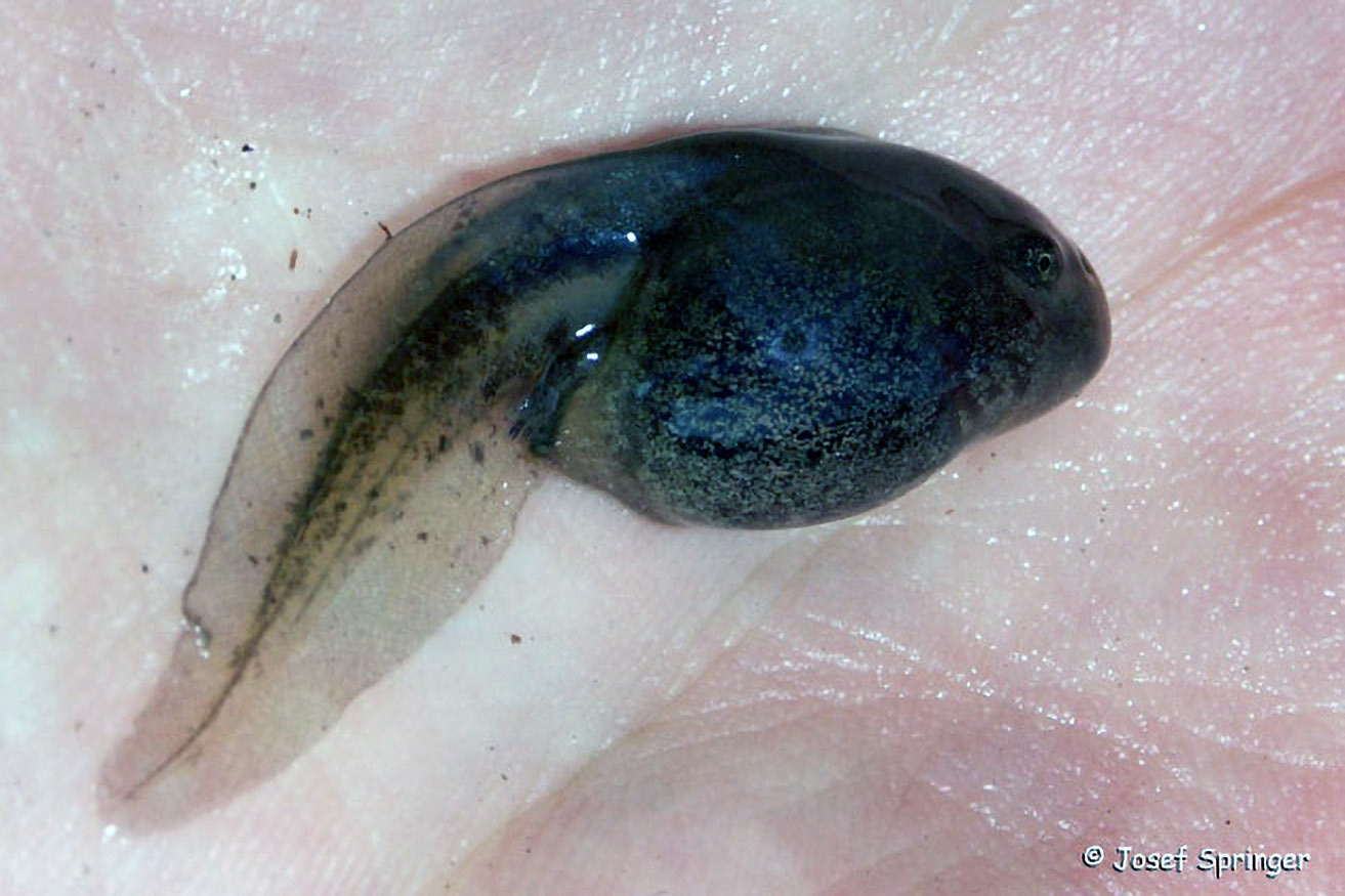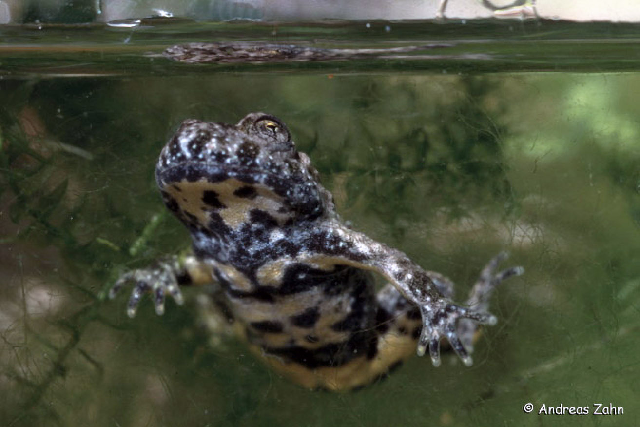 Hier sehen wir eine Gelbbauchunkenlarve kurz vor dem Verlassen des Gewässers. Es sind bereits alle vier Beine vorhanden. Im Unterschied zu erwachsenen Unken besitzt sie noch einen Schwanz, der sich zur Zeit des Landgangs zurückbildet.