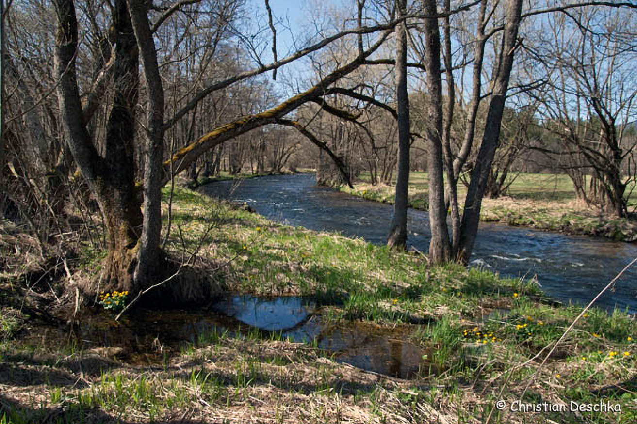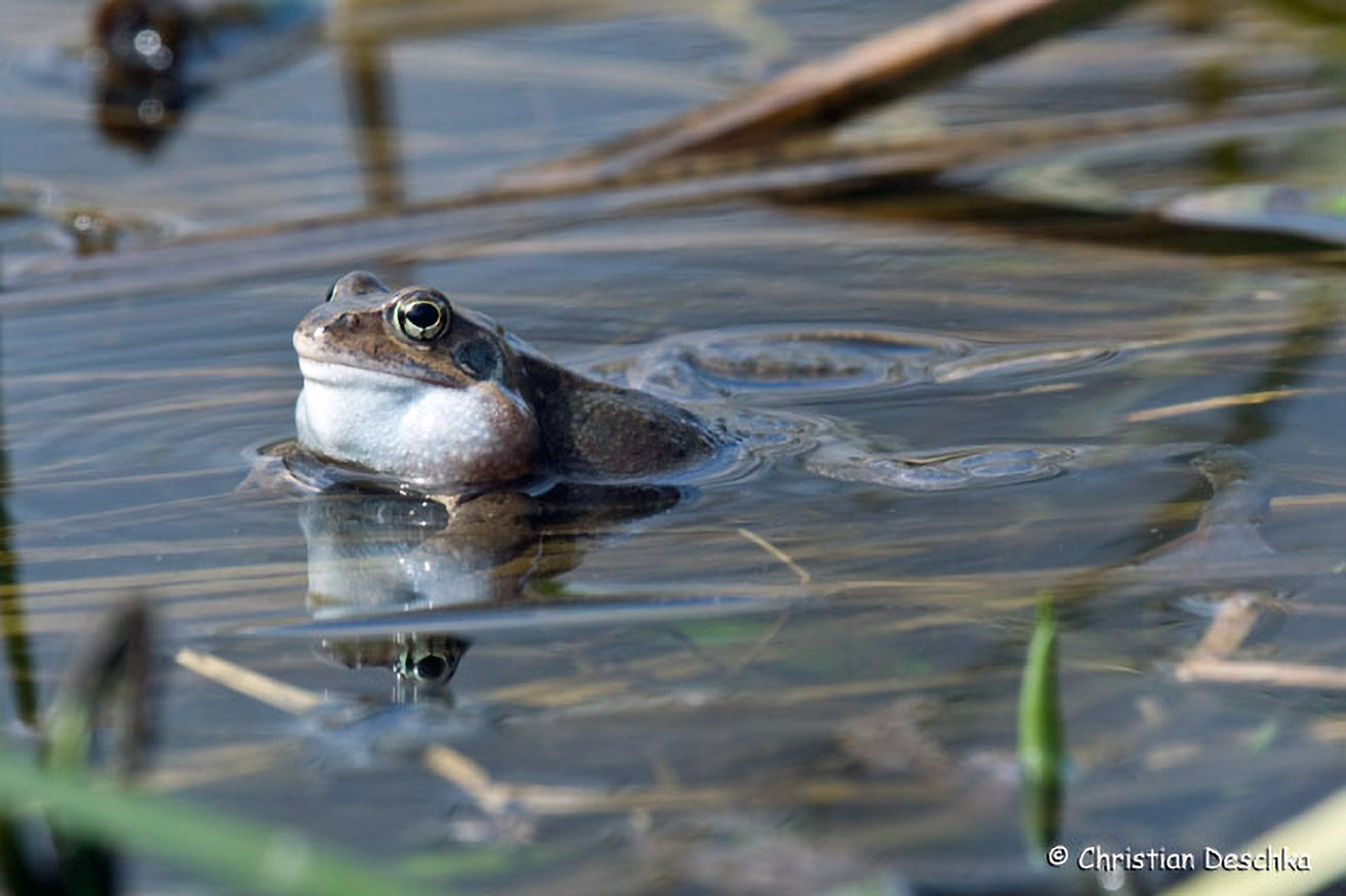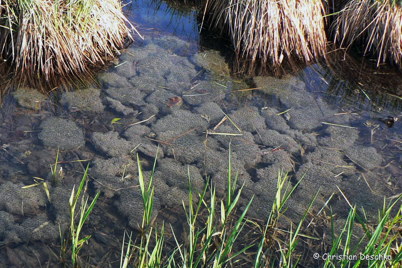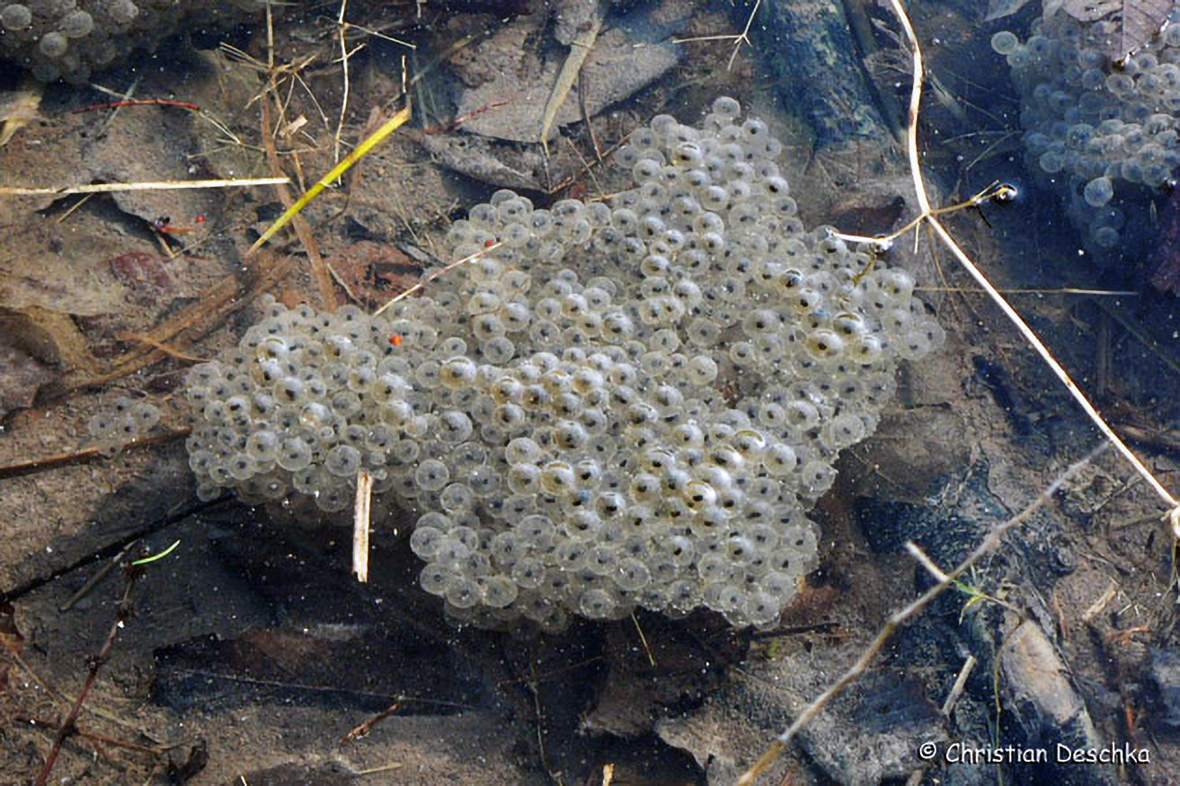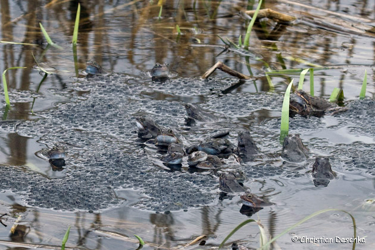 Während Erdkröten schnurförmig ablaichen, sind die Laichballen der Grasfrösche klumpenförmig. Solche flachen und sonnigen Flachwasserbereiche sind für die Jungenentwicklung besonders günstig.