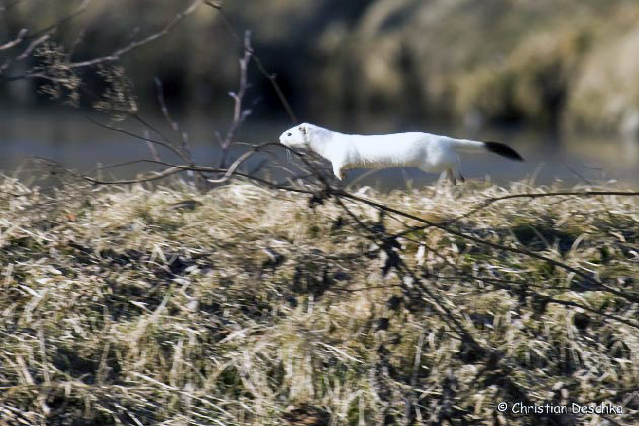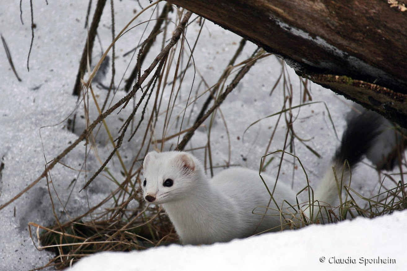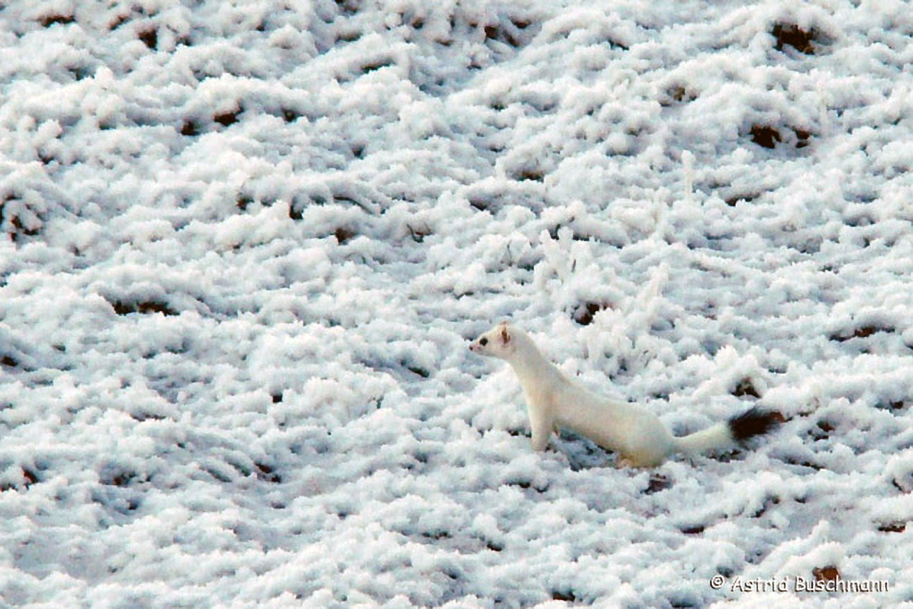 Im Winter wechselt das Hermelin in ein weißes Haarkleid. Lediglich die Schwanzspitze bleibt schwarz. Bei Schnee ist es dann bestens getarnt.