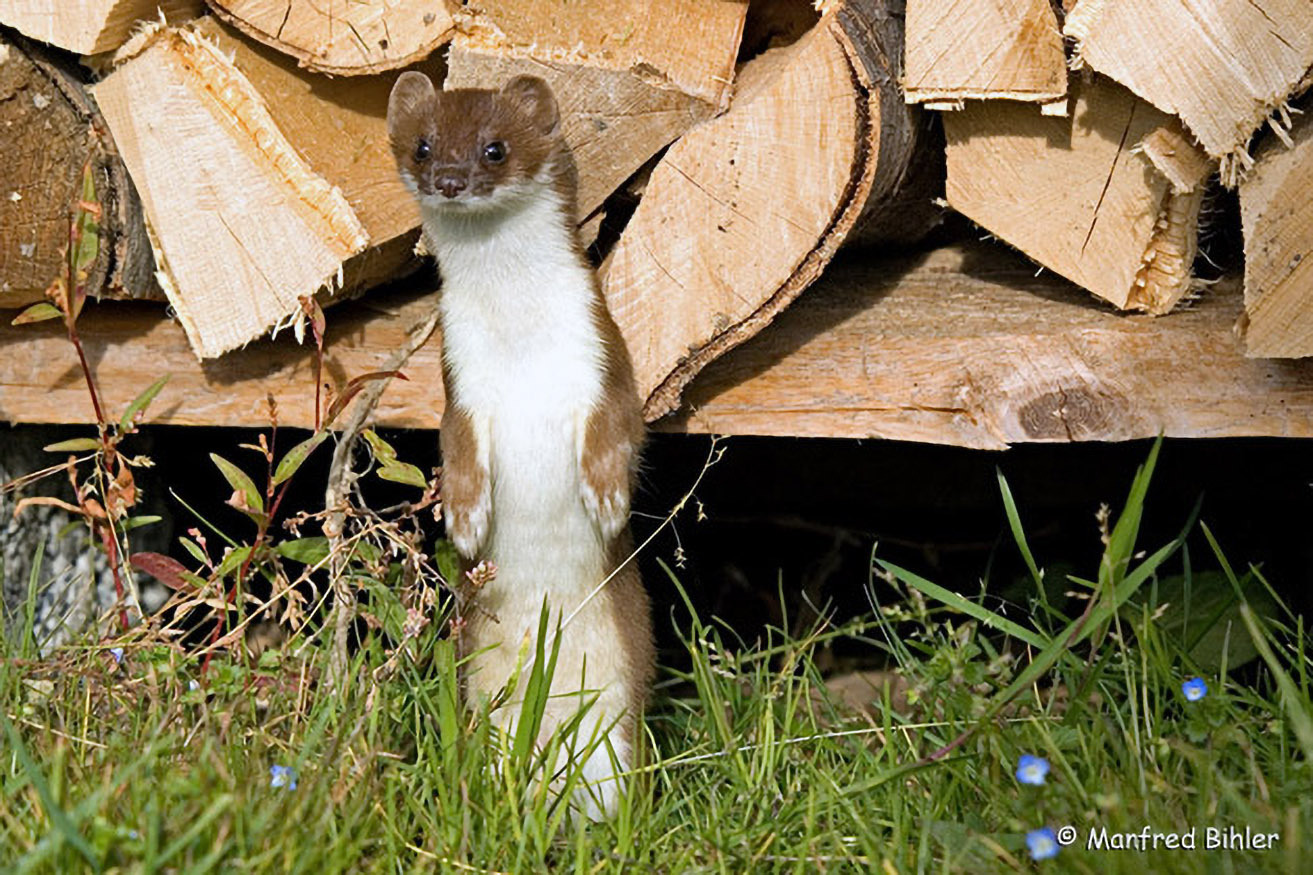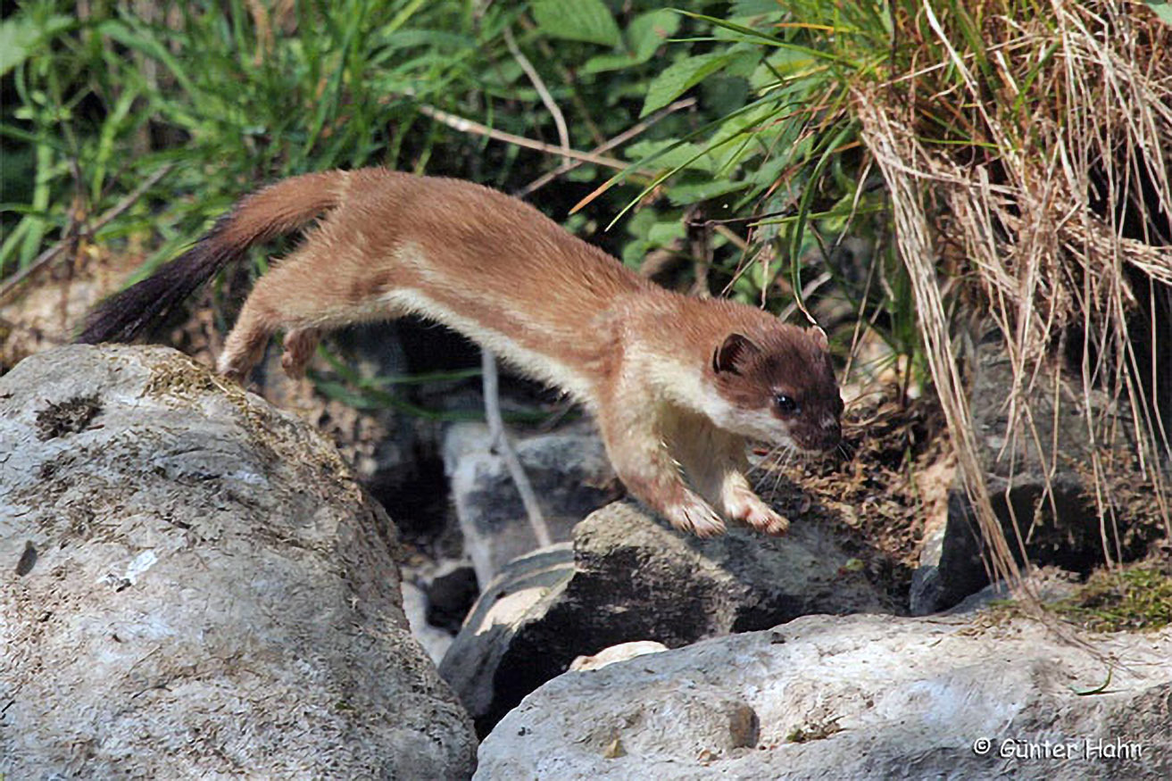 Das Hermelin oder Große Wiesel erkennen wir am lang gestreckten Körper, den kurzen Beinen und dem Schwanz mit schwarzer Endquaste. Im Sommer ist das Fell oberseits braun, unterseits - scharf und geradlinig abgegrenzt - weißlich.