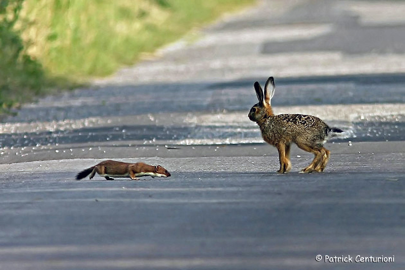 Wird das Hermelin beim Anpirschen entdeckt, hat es keine Chance. Diese Begegnung zwischen einem Hermelin und einem halbwüchsigen Hasen ging daher unblutig aus.