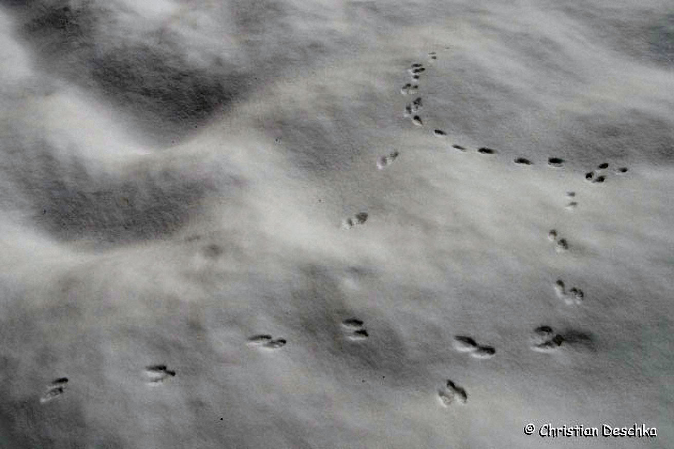 Auf Schnee kann man auch die Fährte des Hermelins finden. Es bewegt sich vorwiegend im Paarsprung fort, hinterlässt also jeweils zwei Pfotenabdrücke nebeneinander.