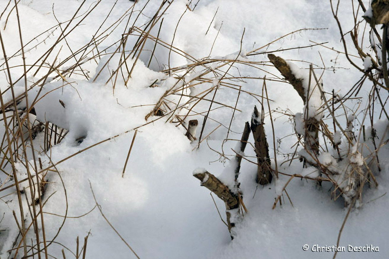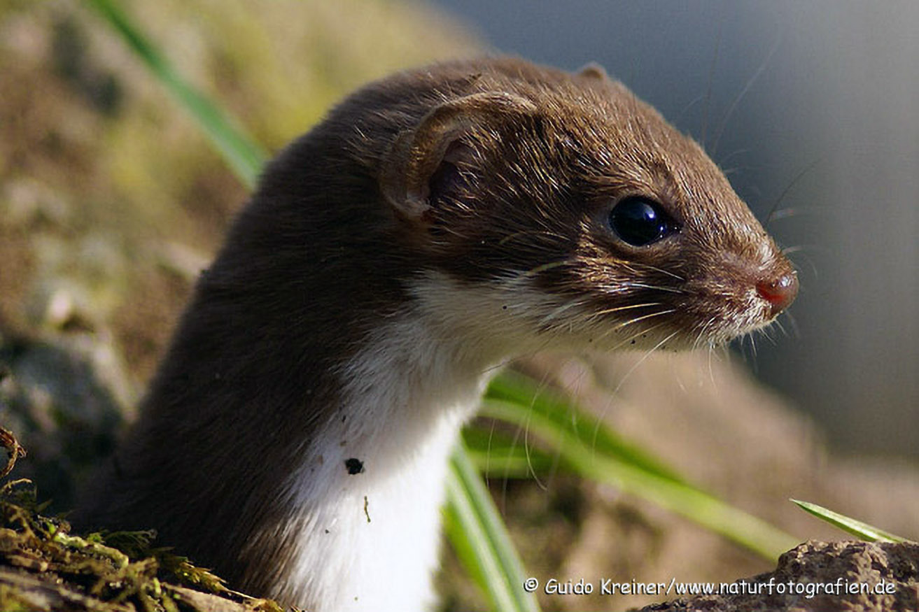 Hier sehen wir ein Mauswiesel, das im Frühling aus einem Mausloch lugt. Man erkennt gut die Tasthaare, mit denen es sich in den dunklen Gängen unter der Erde orientiert.