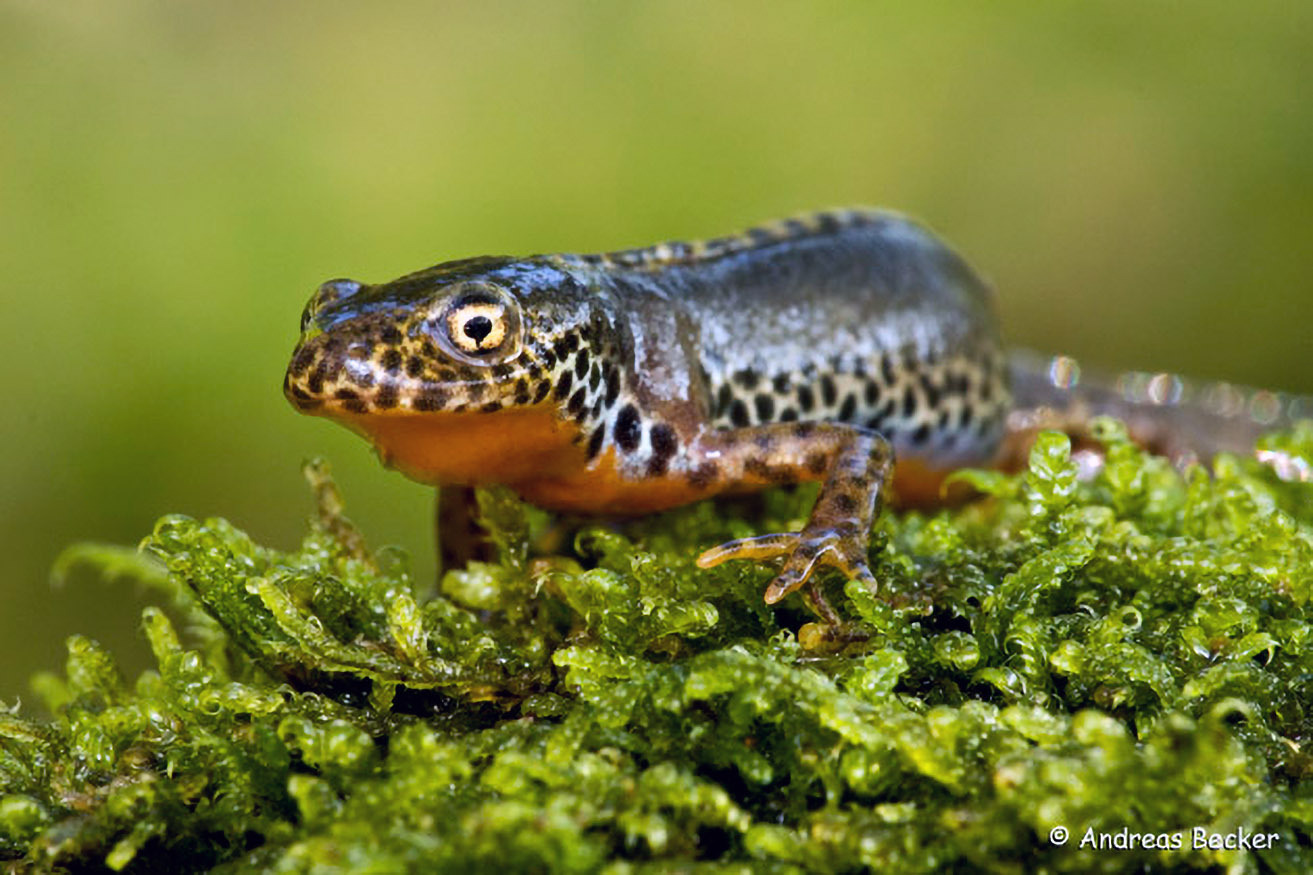 Molche wie dieser Bergmolch pflanzen sich im Frühling in Moortümpeln fort. Im Sommer sind sie dann eher in feuchten Landlebensräumen wie Mooren anzutreffen.