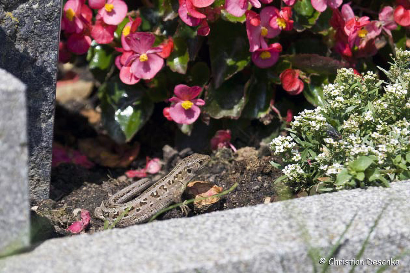 Hier sehen wir ein Zauneidechsen-Weibchen auf einem Grab.