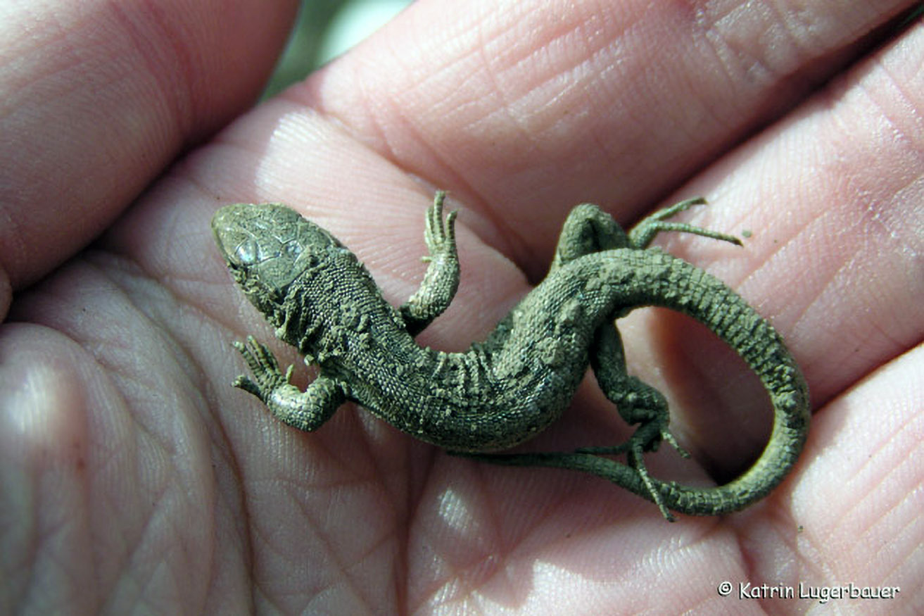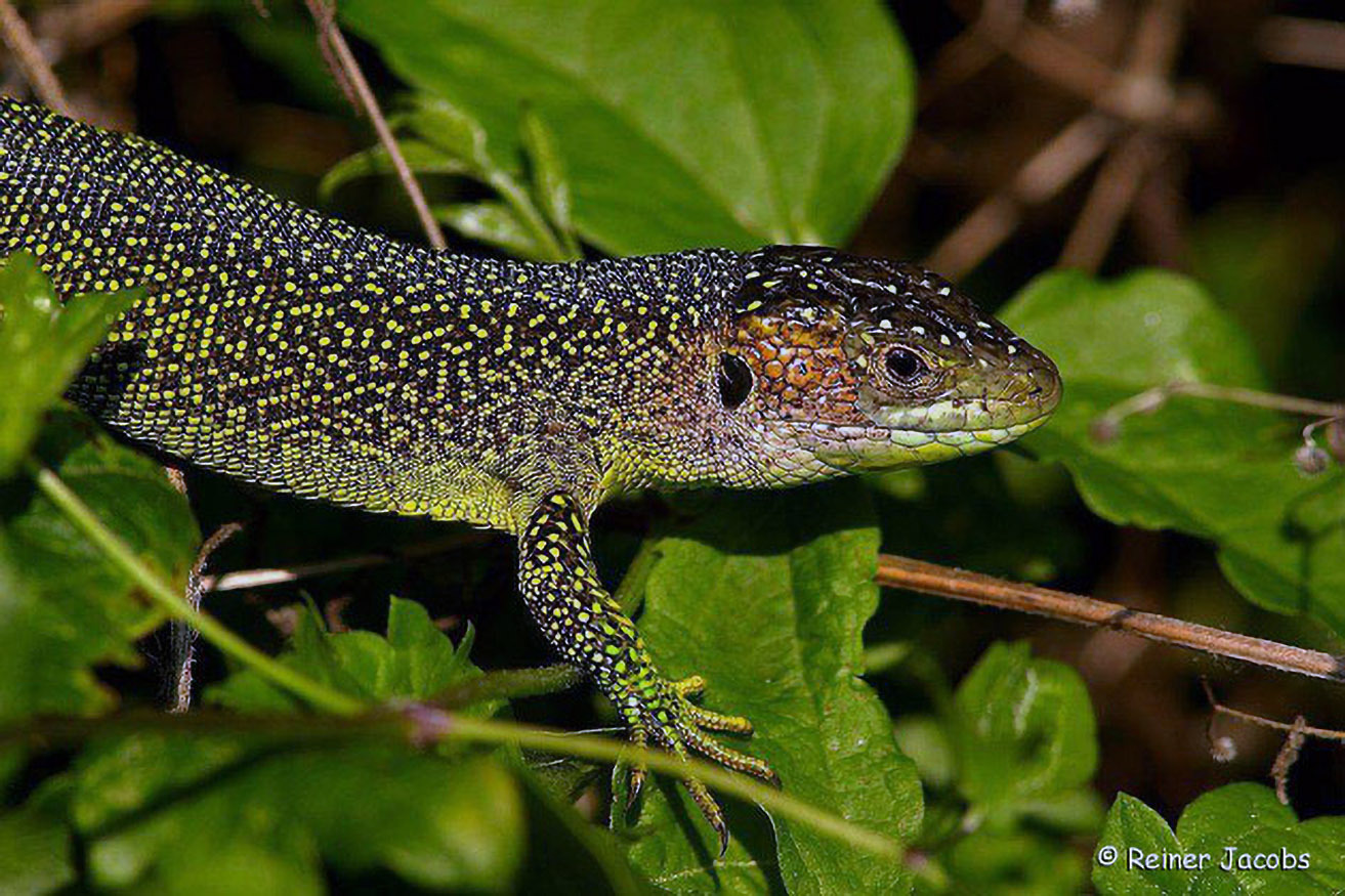 Junge Smaragdeidechsen sind übrigens bräunlich gefärbt und werden erst mit der Zeit den Eltern ähnlicher.