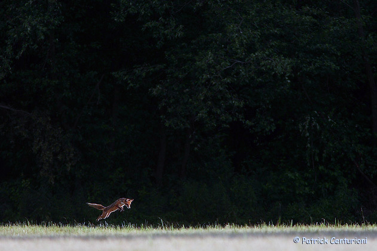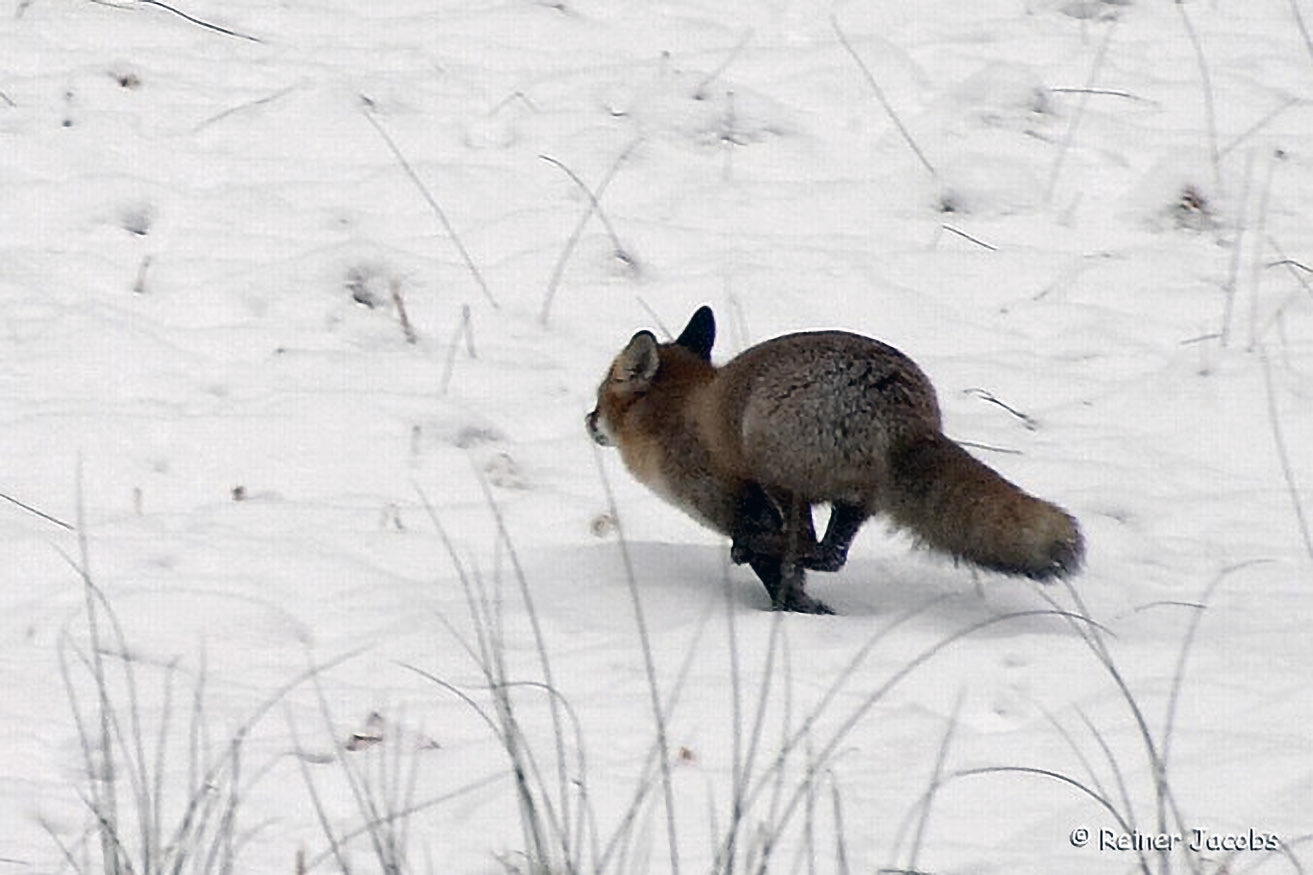 Hier sehen wir einen Fuchs beim "Mausen", also bei der Mäusejagd durch einen zielgerichteten Sprung. Der Schwanz wird dabei als Steuer eingesetzt.