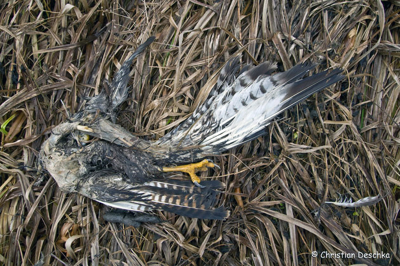Größere Tiere wie dieser Mäusebussard können vom Fuchs nur erbeutet werden, wenn sie geschwächt sind. Der Fuchs hat seinen Kot als "Visitenkarte" hinterlassen.