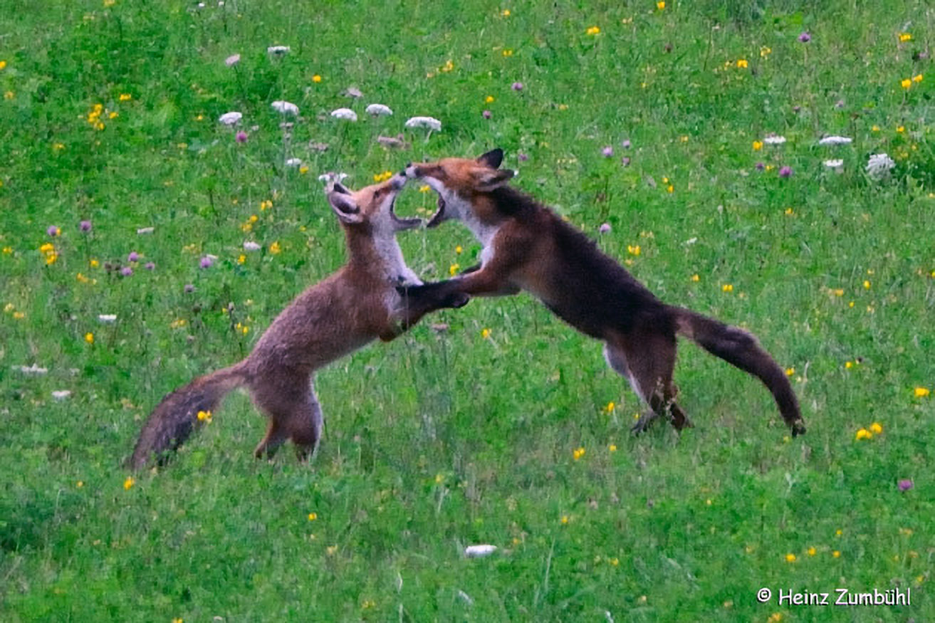 Sie unternehmen bald auch erste Ausflüge ohne Fähe. Diesem Feldhasen sind die beiden Jungfüchse aber nicht gewachsen.