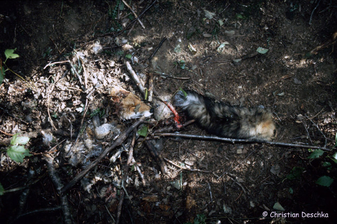 Dieser Fuchs wurde vom Luchs durch Kopfbiss getötet und innerhalb von drei Nächten gefressen. Vom Fuchs blieb lediglich der Kopf, der Schwanz und der Verdauungstrakt übrig.