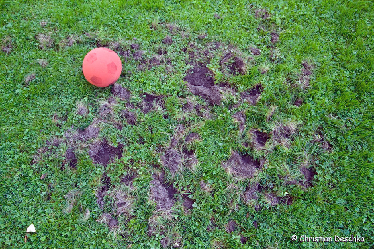 Auf der Suche nach Nahrung "durchpflügen" Wildschwein den Boden. Im Wald ist dies ein Segen, da dadurch z.B. Baumsamen besser keimen können. Auf Wiesen und Äckern hingegen kann dies ein wirtschaftlicher Schaden sein.