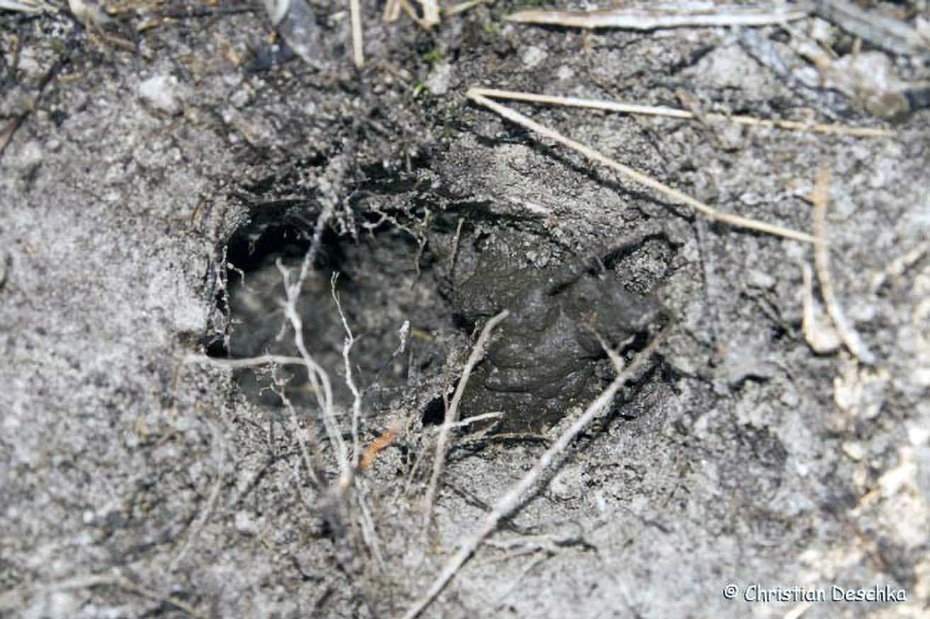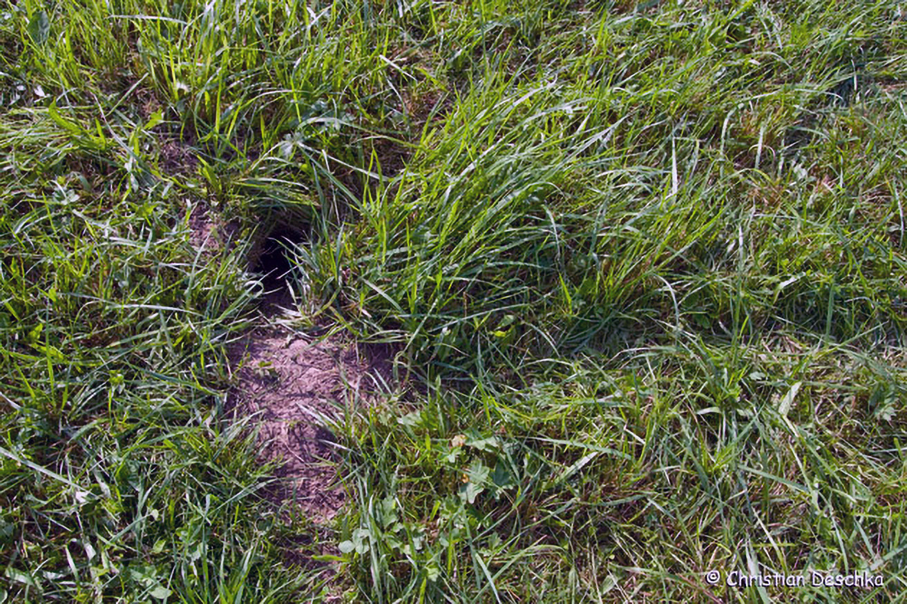 Rund 15 cm große Löcher in Uferböschungen stammen hingegen vom Bisam. Daneben gibt es noch Ein- bzw. Ausgänge unter Wasser und im ebenen Bereich der angrenzenden Wiesen und Felder.