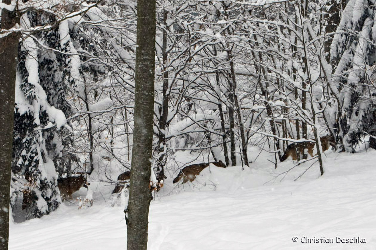 Auf der Flucht entsteht eine Fährte aus verschiedenartigen Vierer-Sprunggruppen.