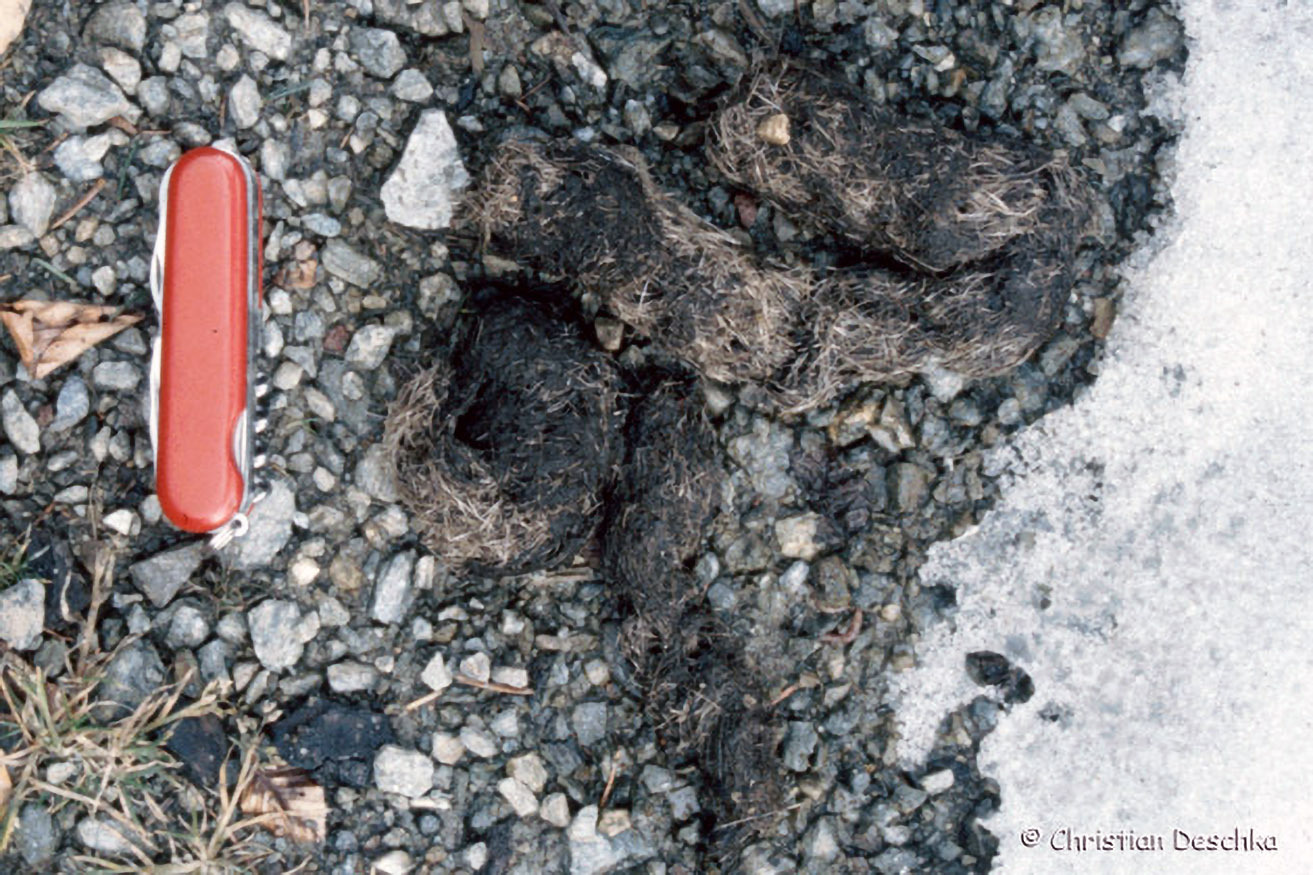 Die Losung der heimischen Hasenartigen besteht aus etwas abgeflachten Kugeln. Daneben hinterlassen die drei Arten Feldhase, Schneehase und Wildkaninchen auch noch Nagespuren an Gehölzen.