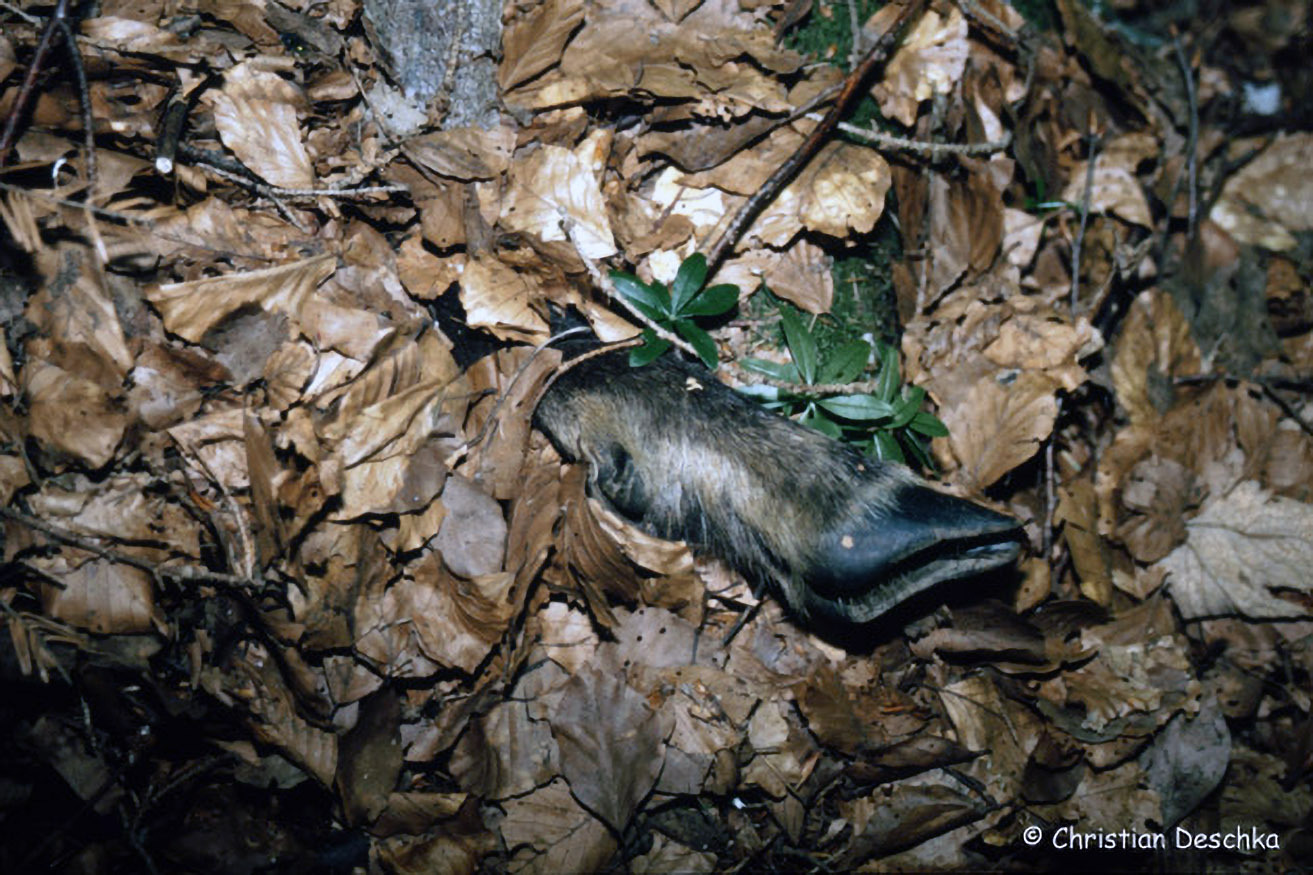 Vor den Niederlegen schlagen Rehe mit den Vorderbeinen ein "Bett" frei. Man kann darin auch Harnflecken und/oder Kot finden.