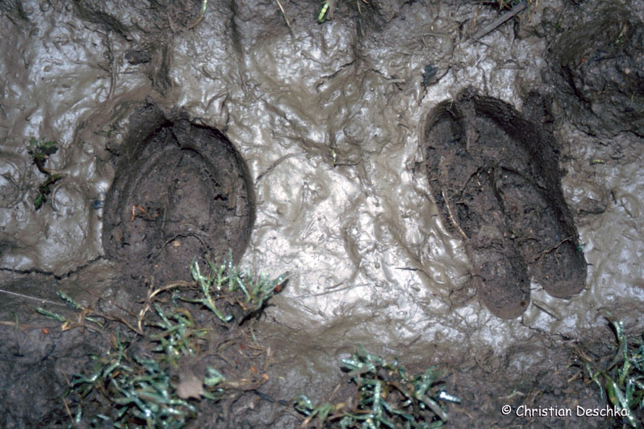 Bei Rothirsch-Trittsiegeln ist meist kein Abdruck der Nebenzehen sichtbar. Die rundlichen Ballen am Hinterende nehmen etwa ein Drittel der Schalenlänge ein.