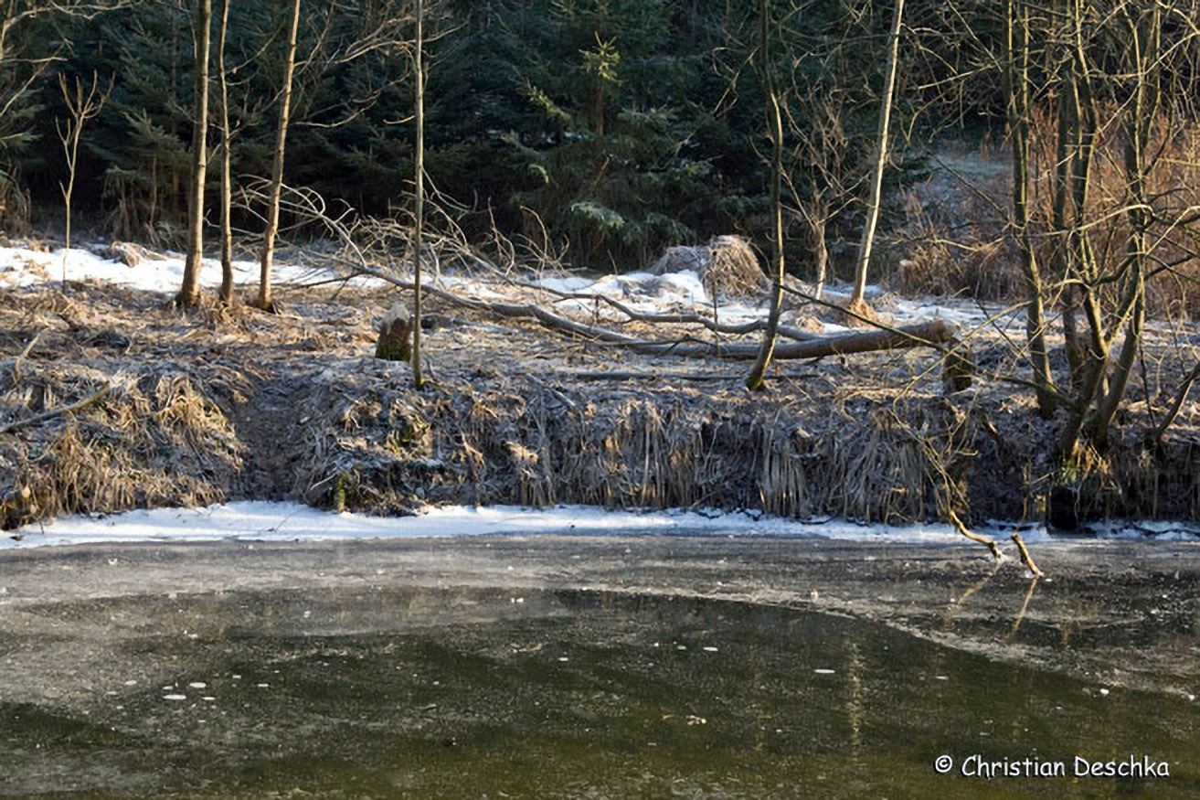 Im Winter findet man jede Menge Tierspuren. Die Nagespuren des Bibers sind auch dann zu sehen, wenn kein Schnee liegt. Links hat er einen kleinen Baum abgenagt und verschleppt. Der rechte Baum ist noch in Arbeit ...