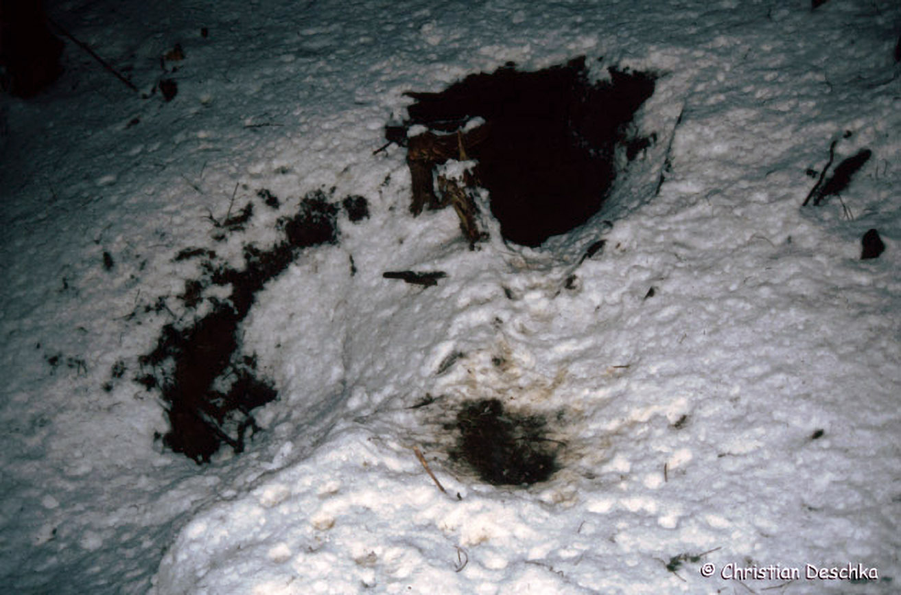 Verlassene Liegeplätze ("Betten") sind leicht als solche erkennbar. Manchmal enthalten sie auch Kot und/oder Urin (erkennbar am orangerot verfärbten Schnee).