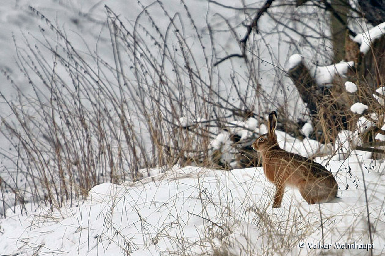 Feldhasen ernähren sich im Winter vorwiegend von Knospen heimischer Bäume und Sträucher. Man findet dann die Tritte eng beieinander, dazwischen auch gelegentlich ein paar Hasenbemerl und Urin (orange verfärbten Schnee).