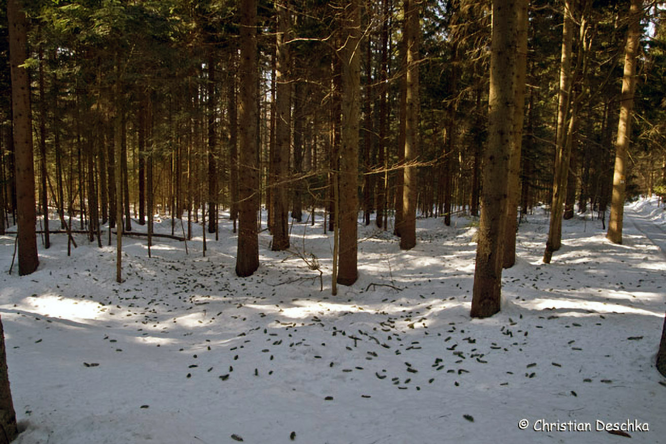 Eichhörnchen beißen im Winter gerne Fichtentriebe ab, die dann unter manchen Bäumen über den Boden verstreut zu finden sind.