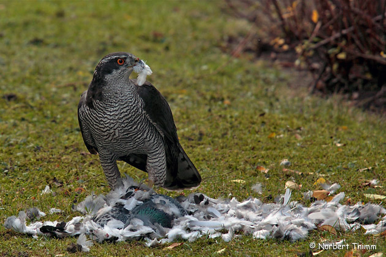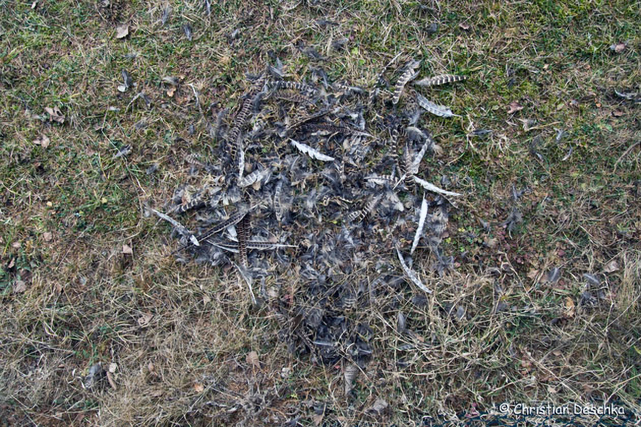 Hier sieht man einen Habicht beim Rupfen einer Straßentaube. Die Federn werden einzeln oder in kleinen Büscheln ausgerupft und bleiben dabei - im Unterschied zu Marder und Fuchs - unversehrt.