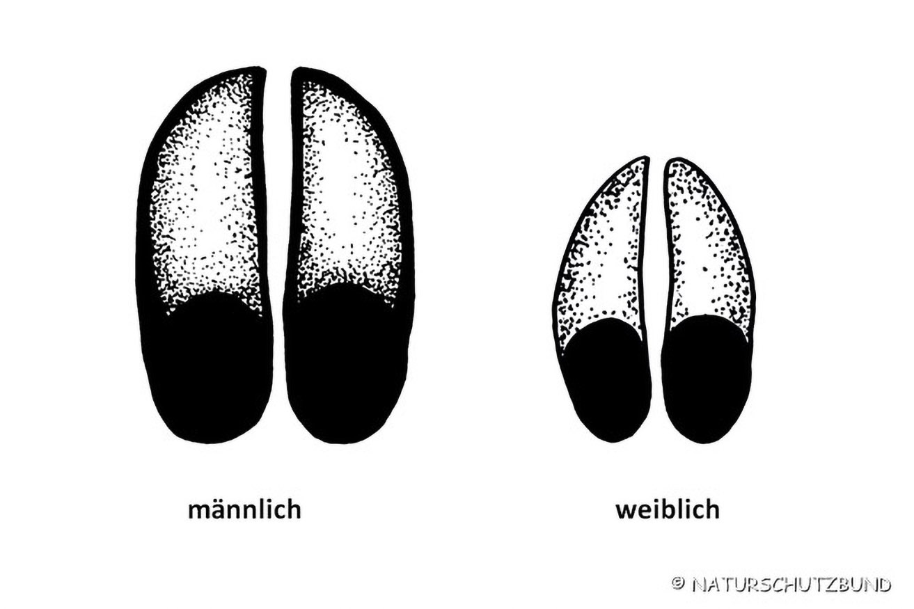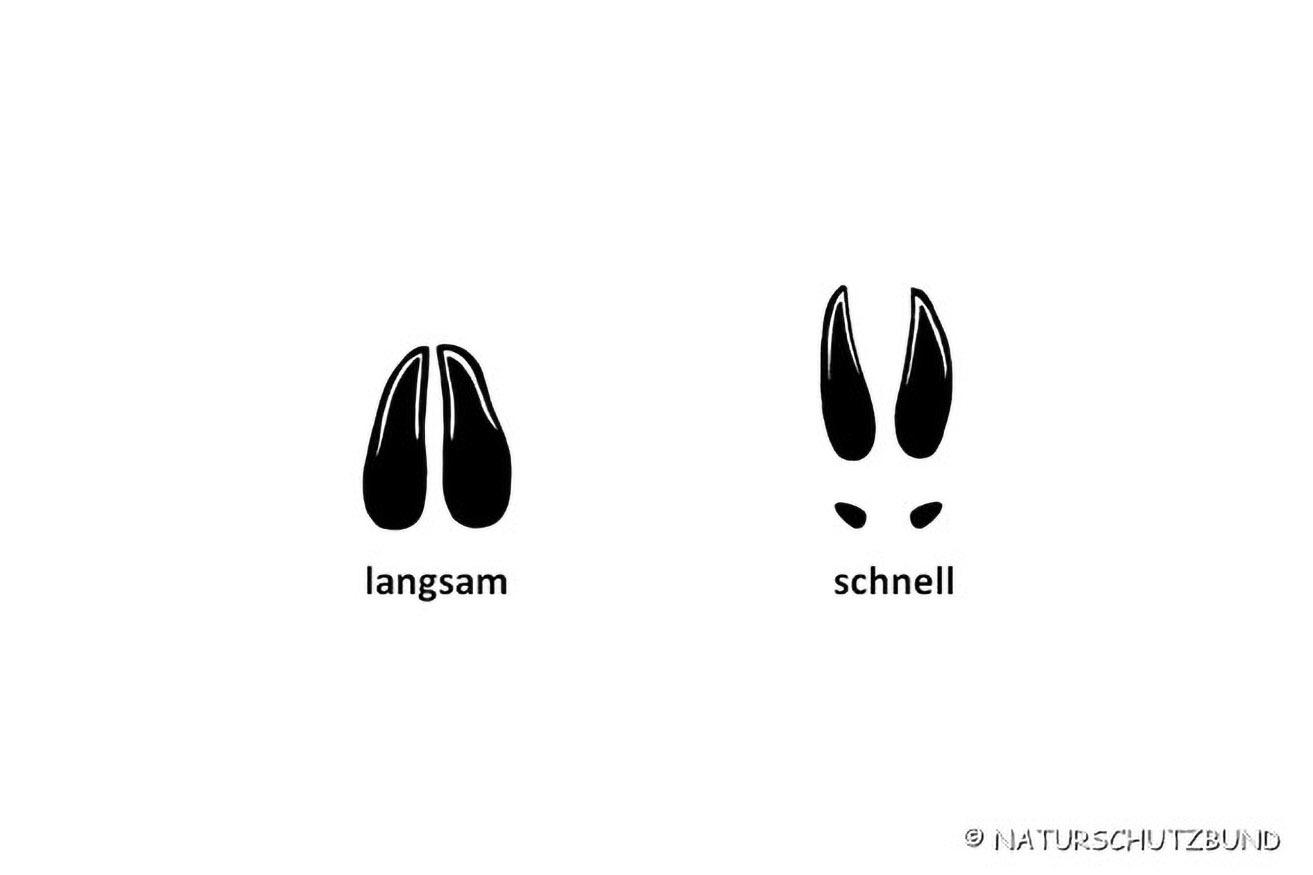 Die deutlich schmaleren Abdrücke der Gämse sind ebenfalls im Gebirge zu finden. Oft ist auffällig viel Platz zwischen den beiden Hufen.