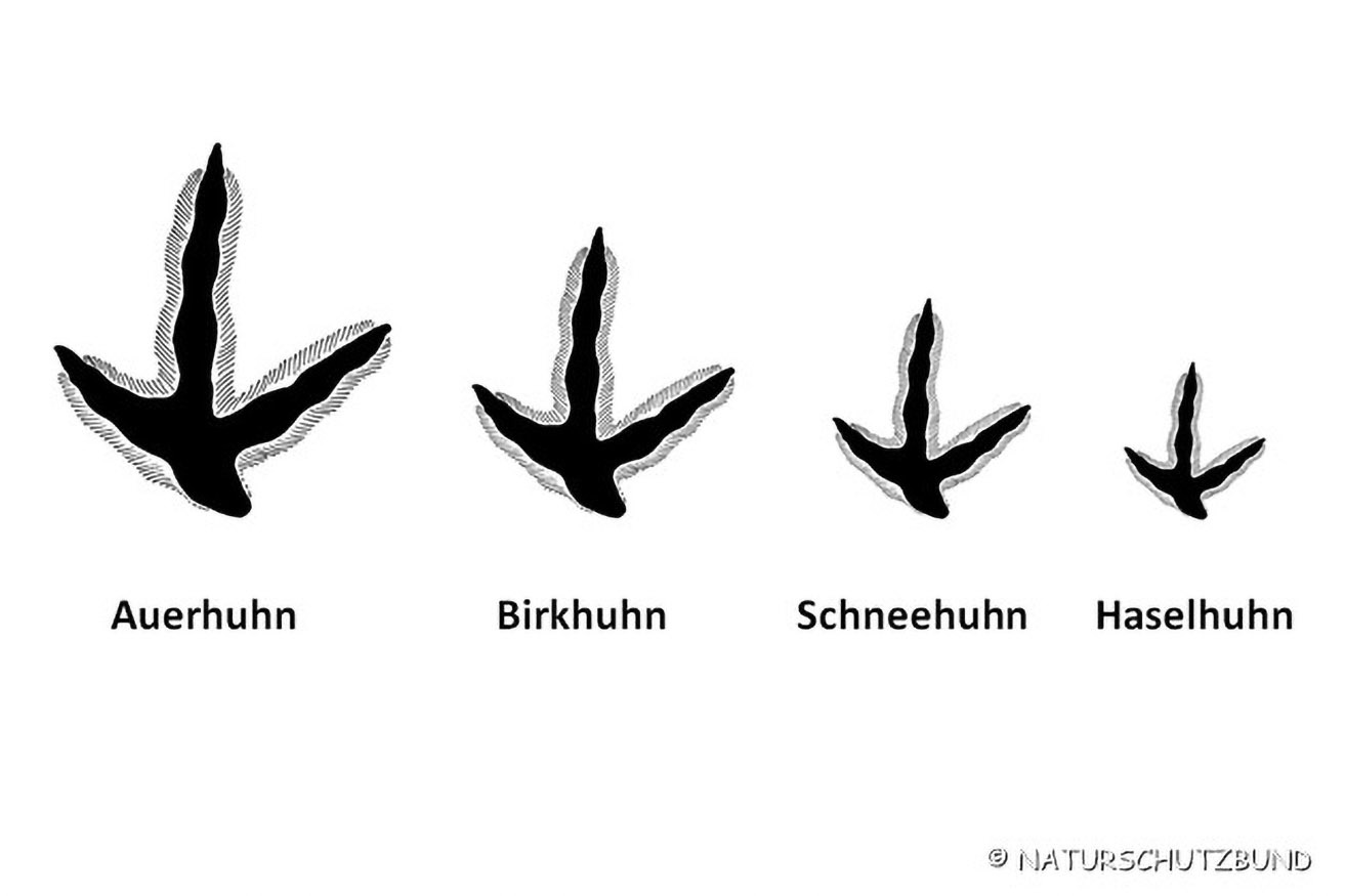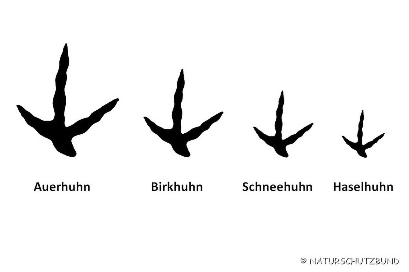 Die Trittsiegel von Auerhuhn, Birkhuhn, Schneehuhn und Haselhuhn sehen sehr ähnlich aus. Um so kleiner die Art, um so kleiner ist aber auch der Abdruck ihres Scharrfußes.