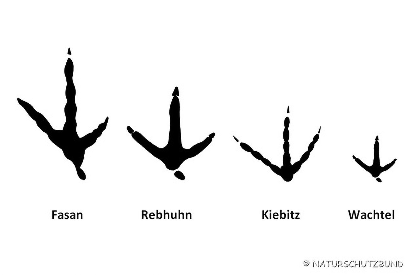 Unsere Feldhühner haben unbefiederte Füße. Die Länge der Trittsiegel reicht von 7 cm beim Fasan bis gut 2 cm bei der Wachtel.